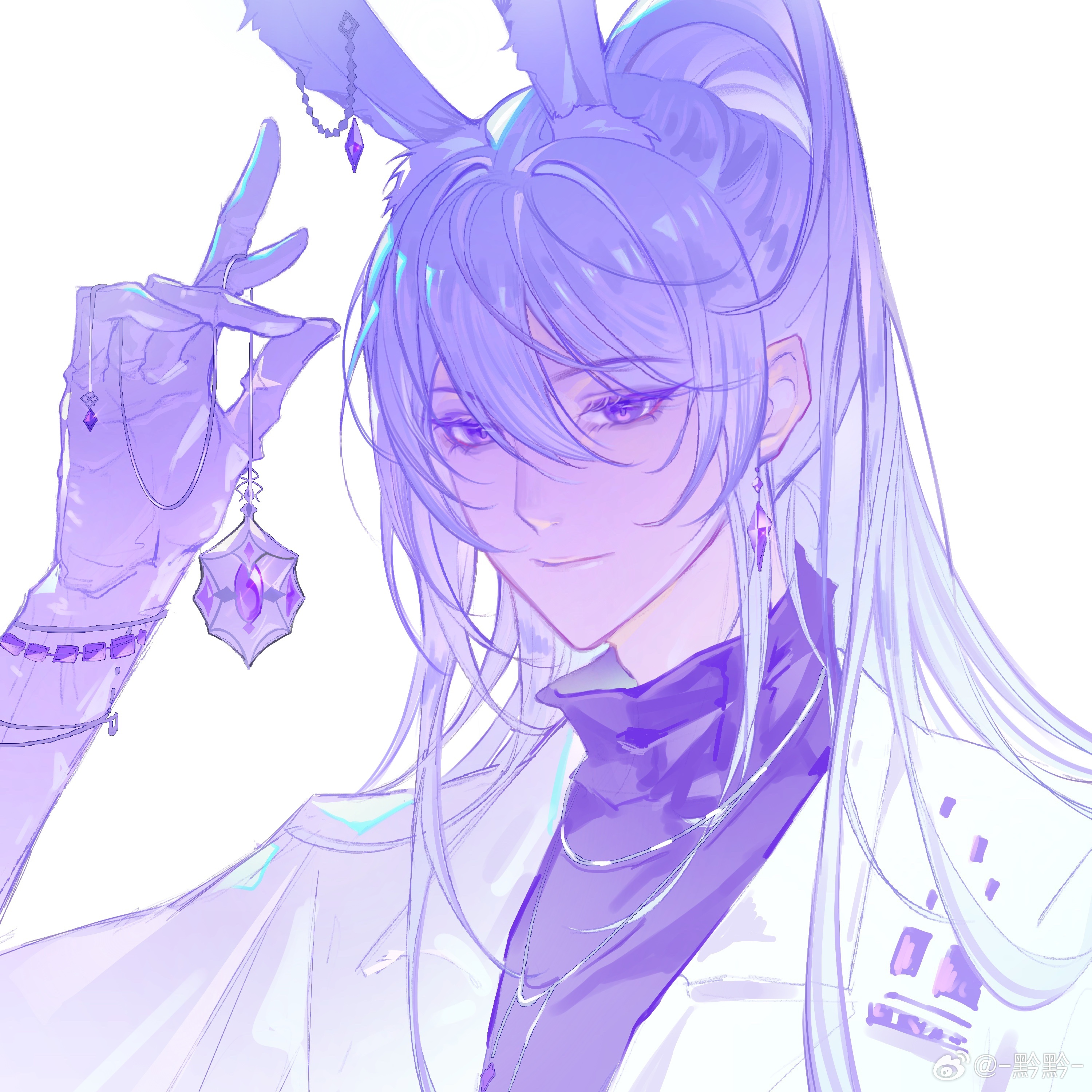1boy absurdres animal_ears bracelet cael_anselm cael_anselm_(bejeweled_heart) chinese_commentary closed_mouth diamond_earrings ear_piercing earrings extra_ears gem gloves hair_between_eyes hand_up high_ponytail highres holding holding_pendant jacket jewelry kemonomimi_mode long_hair long_sleeves looking_at_viewer lovebrush_chronicles male_focus necklace pendant piercing ponytail portrait purple_eyes purple_gem purple_shirt purple_theme qianqian_(weibo_7786930893) rabbit_boy rabbit_ears shirt simple_background smile solo suit_jacket turtleneck turtleneck_shirt watermark weibo_watermark white_background white_gloves white_hair white_jacket