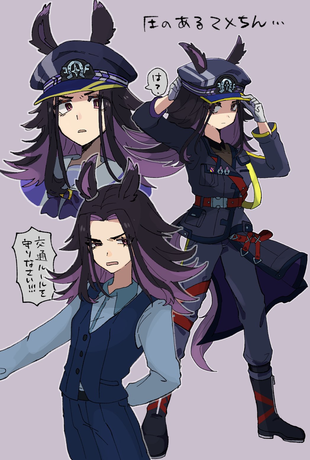 1girl adjusting_clothes adjusting_headwear animal_ears black_hair blue_pants blue_shirt blue_vest bow bowtie commentary_request donguri_big ears_through_headwear fenomeno_(black_flames_of_the_righteous_spirit)_(umamusume) fenomeno_(casual)_(umamusume) fenomeno_(umamusume) flipped_hair gloves hat highres horse_ears horse_girl horse_tail horseshoe_hat_ornament horseshoe_ornament long_hair long_sleeves looking_at_viewer multiple_views pants peaked_cap purple_background purple_bow purple_bowtie purple_eyes purple_hair purple_shirt sailor_collar sailor_shirt school_uniform shirt simple_background striped_hat tail tracen_school_uniform translation_request umamusume vest white_gloves