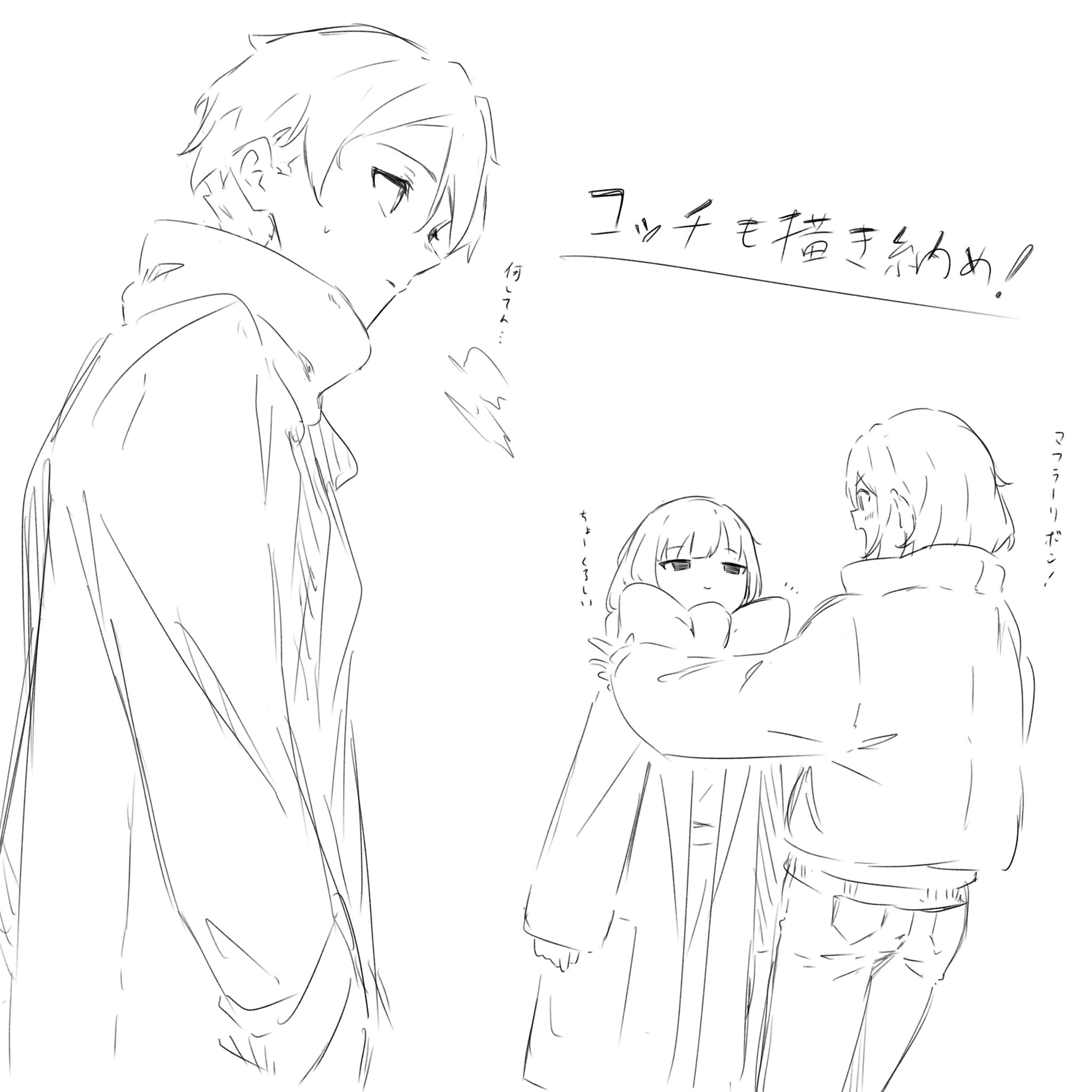 1boy 2girls coat greyscale highres jacket kai_ayame kanadate_ruri kanade_(kanade_3344) long_hair long_sleeves monochrome multiple_girls original pants scarf short_hair simple_background translation_request white_background winter_clothes yahazu_tobira