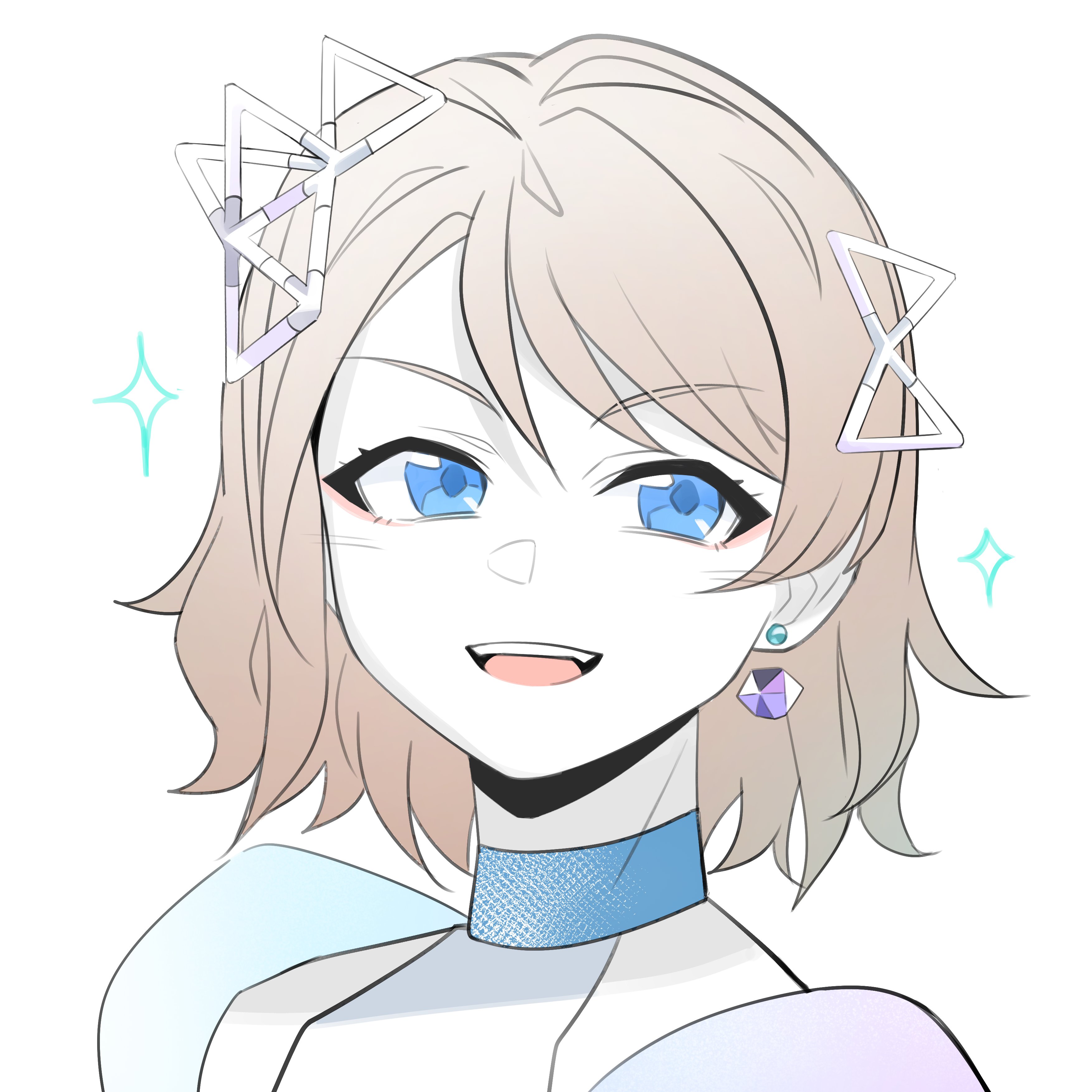 1girl absurdres achin_(putsi_2025) banzai!_digital_trippers blue_eyes blush brown_hair choker dress earrings fang floating_earrings gem grey_hair hair_ornament head_tilt highres idol jewelry looking_at_viewer love_live! love_live!_sunshine!! open_mouth puffy_sleeves short_hair simple_background single_earring solo star_(symbol) teeth upper_body upper_teeth_only watanabe_you wavy_hair white_background
