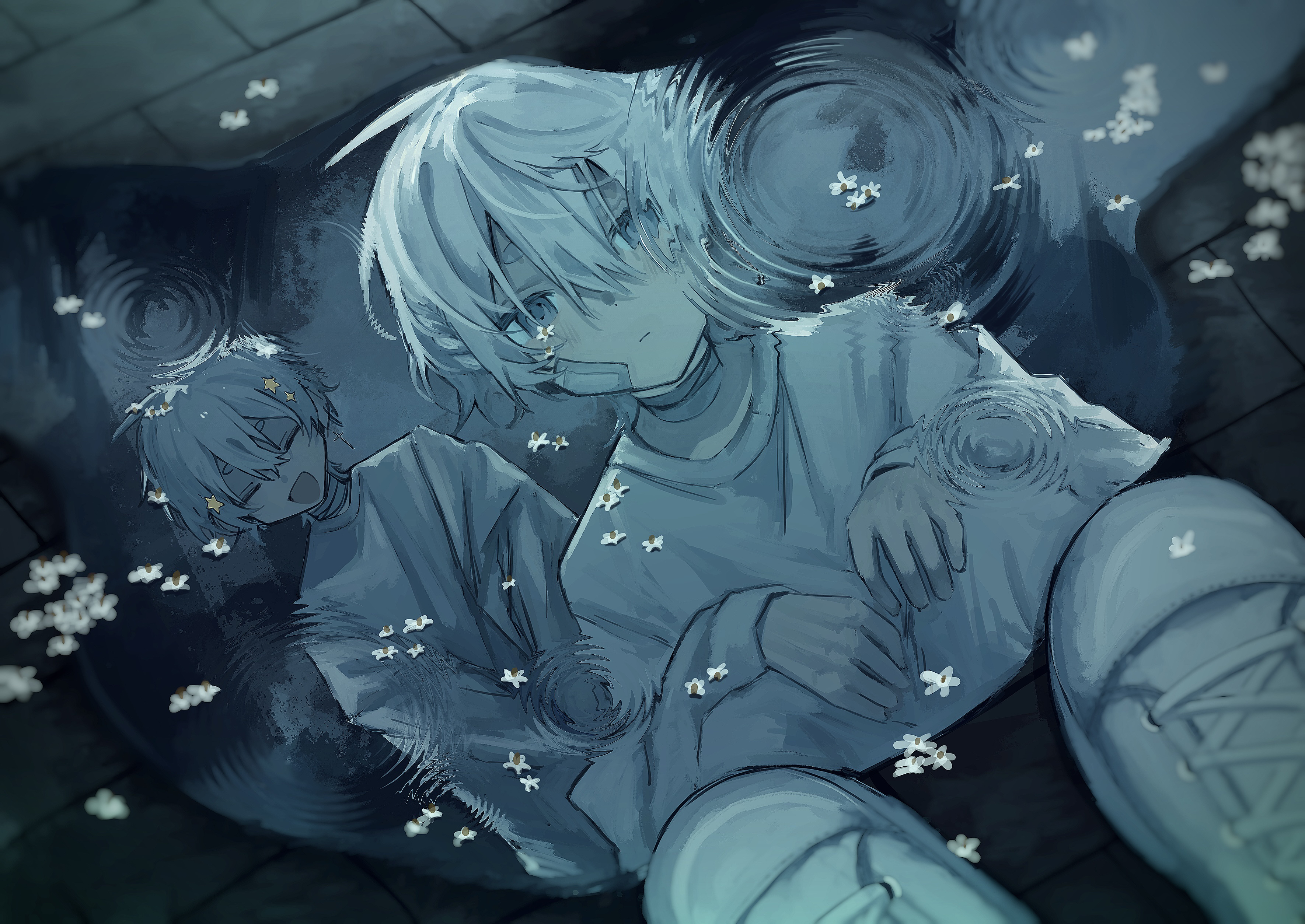 2boys :d absurdres bandaged_neck bandages blue_eyes closed_eyes closed_mouth dot_nose flower hair_between_eyes hair_ornament hands_on_own_knees highres long_sleeves looking_at_reflection male_focus multiple_boys open_mouth original puddle reflection reflection_focus reflective_liquid ripples shirt shoelaces shoes short_hair smile squatting star_(symbol) star_hair_ornament water white_hair white_shirt white_shoes yuruku