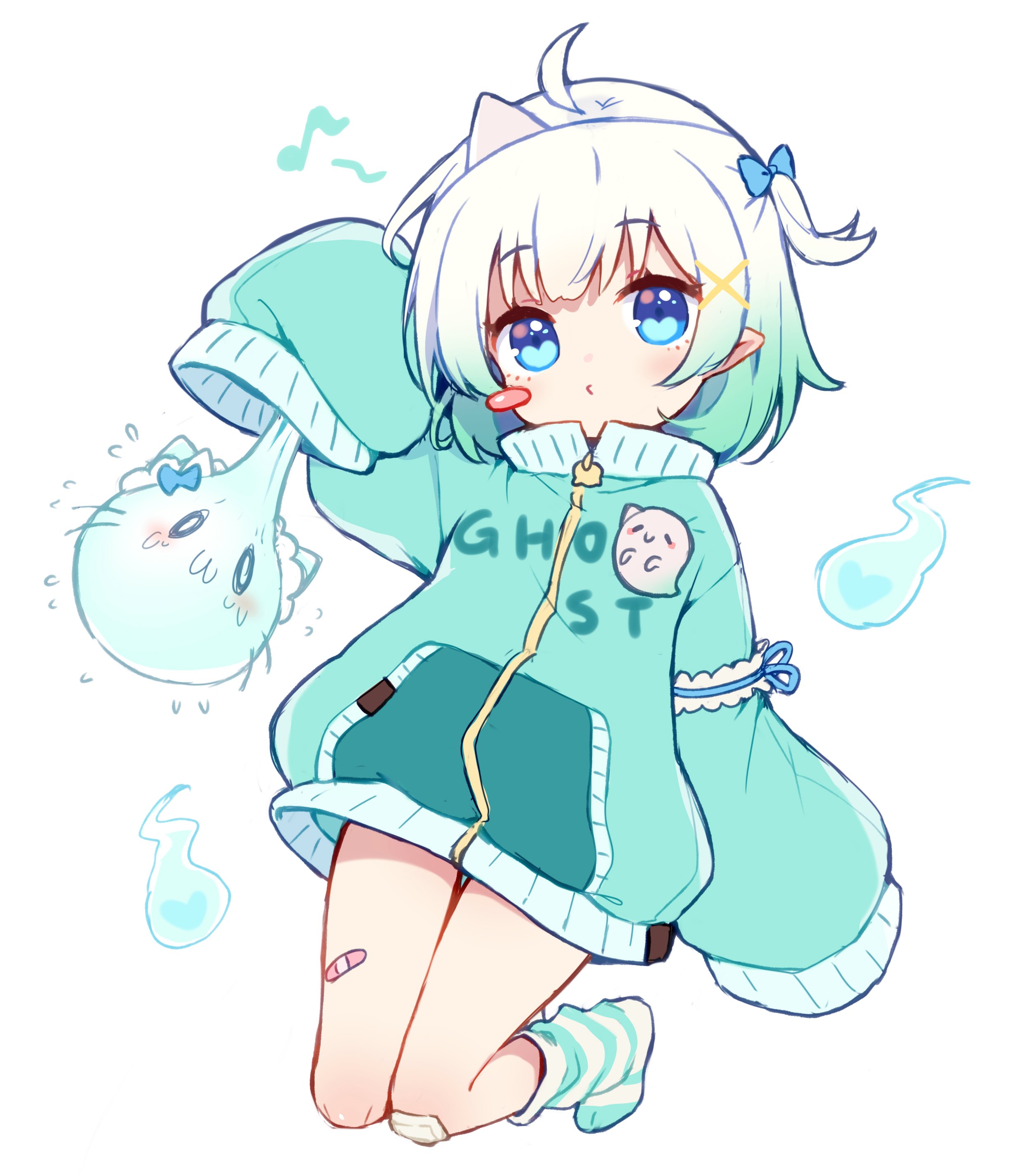 1girl absurdres ahoge bandaid blue_eyes densetsu.exe ghost ghost_girl highres legs mint_fantome moorina multicolored_hair musical_note pointy_ears short_hair socks striped_clothes striped_socks track_suit triangular_headpiece virtual_youtuber white_background white_hair
