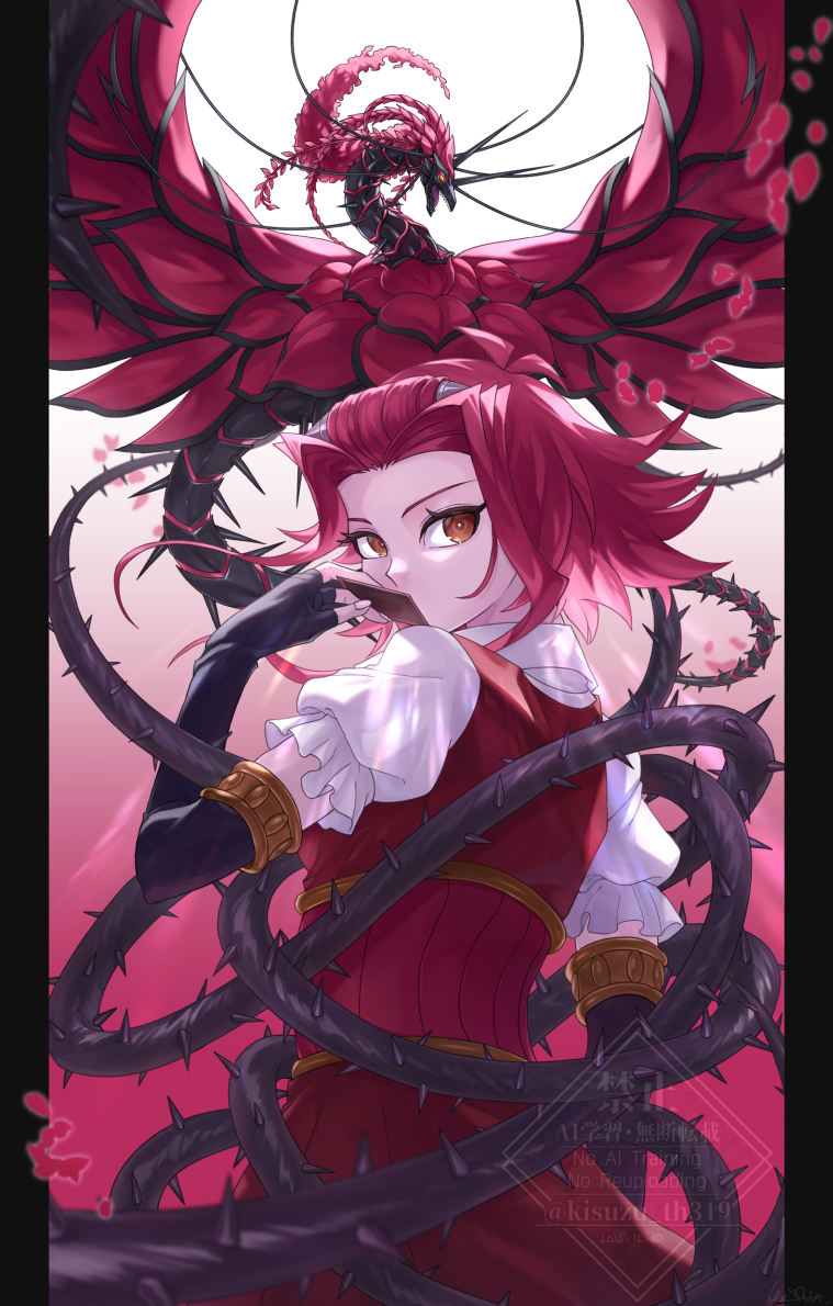 1girl black_rose_dragon brown_eyes card commentary_request covering_own_mouth dragon dress duel_monster elbow_gloves fingerless_gloves from_behind gloves holding holding_card izayoi_aki kisuzu_th319 looking_at_viewer looking_back plant puffy_short_sleeves puffy_sleeves red_dress red_hair short_hair_with_long_locks short_sleeves sidelocks thorns vines yu-gi-oh! yu-gi-oh!_5d's