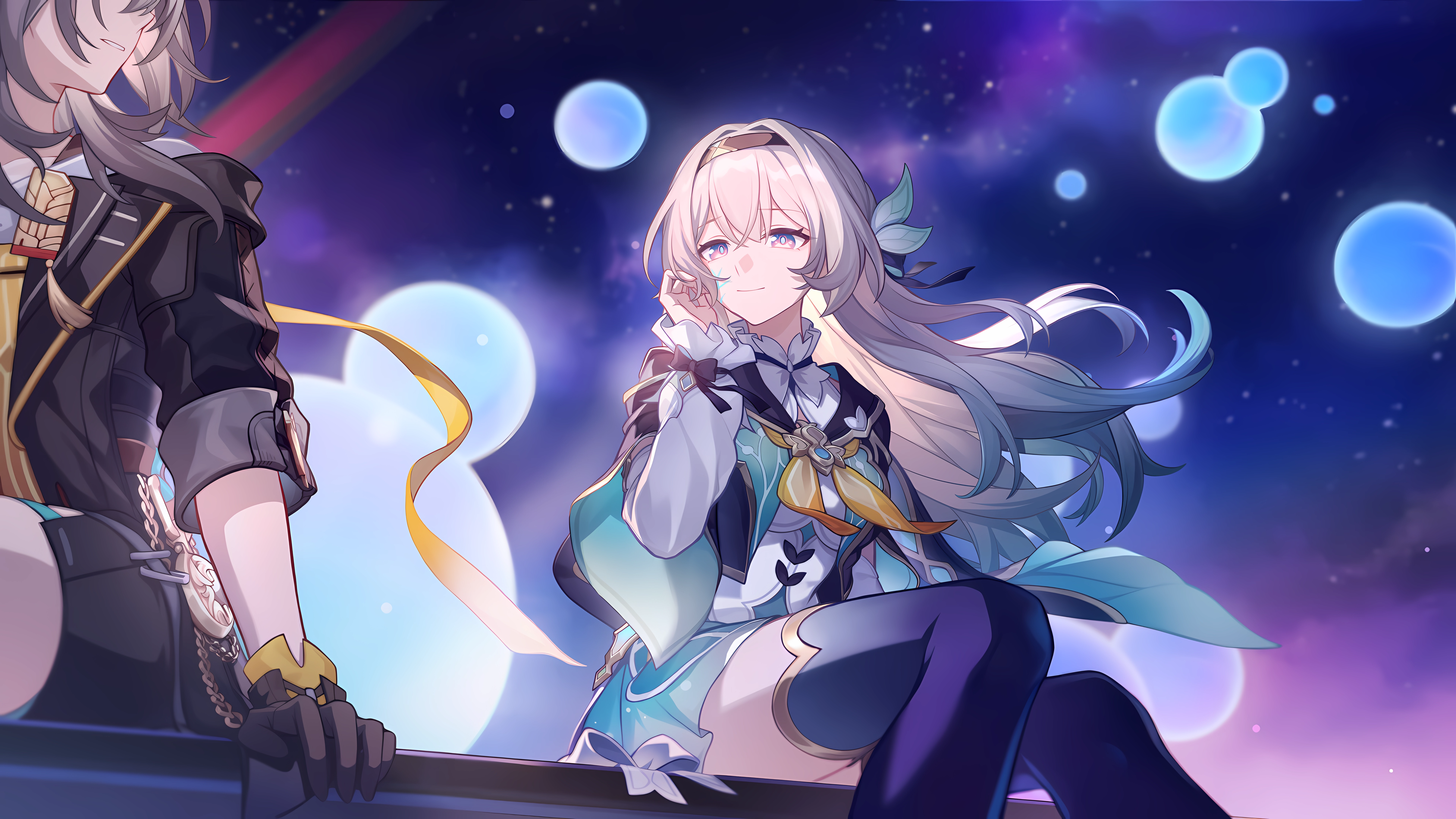 2girls absurdres adjusting_hair bad_link bad_miyoushe_link black_gloves black_hairband black_jacket black_ribbon black_shirt black_thighhighs blue_eyes bubble cracked_skin dress firefly_(honkai:_star_rail) game_cg gloves gradient_hair green_dress green_hair grey_hair hair_between_eyes hair_ornament hair_ribbon hairband highres honkai:_star_rail honkai_(series) jacket long_hair long_sleeves looking_at_another looking_at_viewer multicolored_eyes multicolored_hair multiple_girls neckerchief night official_art parted_lips pocket_watch purple_eyes ribbon shirt sitting sky smile star_(sky) starry_sky stelle_(honkai:_star_rail) thighhighs trailblazer_(honkai:_star_rail) two-tone_eyes two-tone_hair watch white_shirt yellow_neckerchief
