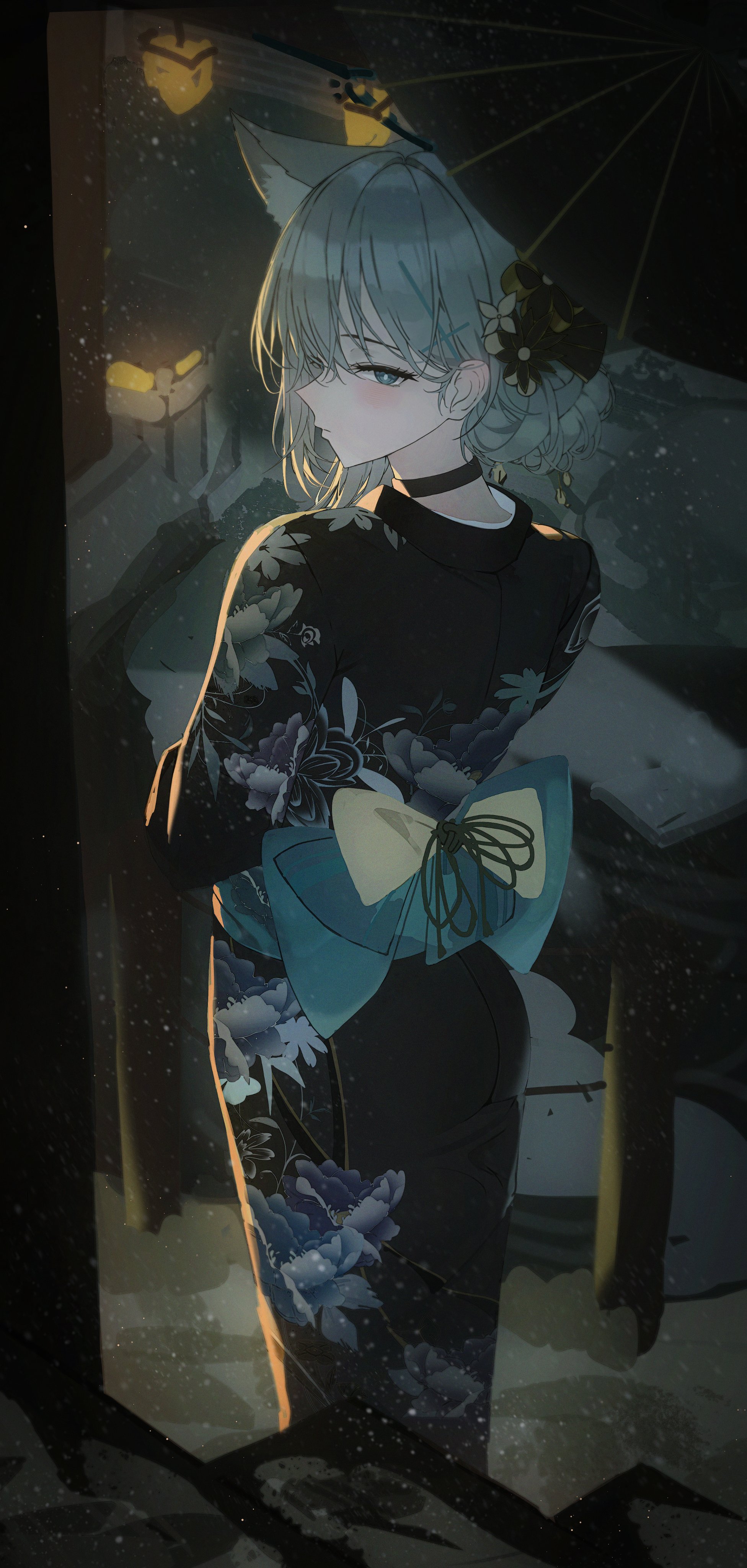 1girl absurdres alternate_costume animal_ear_fluff animal_ears black_choker black_kimono black_umbrella blue_archive blue_sash blush choker closed_mouth commentary cross_hair_ornament floral_print floral_print_kimono from_behind grey_eyes grey_hair hair_ornament highres japanese_clothes k.j. kimono looking_at_viewer looking_back night outdoors print_kimono sash shiroko_terror_(blue_archive) solo umbrella wolf_ears