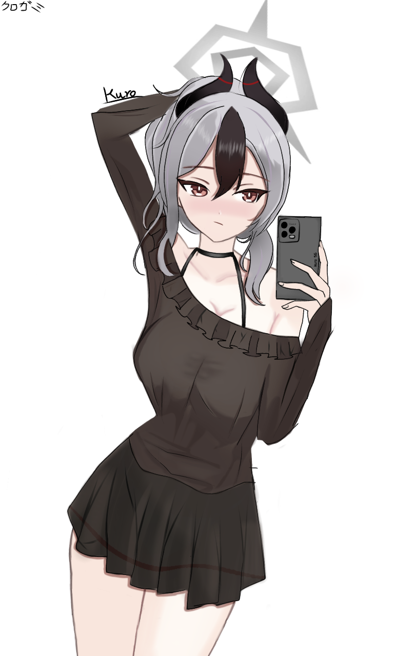 black_skirt blue_archive collarbone commentary_request halo highres horns kayoko_(blue_archive) kurogami_fuyuki off_shoulder skirt