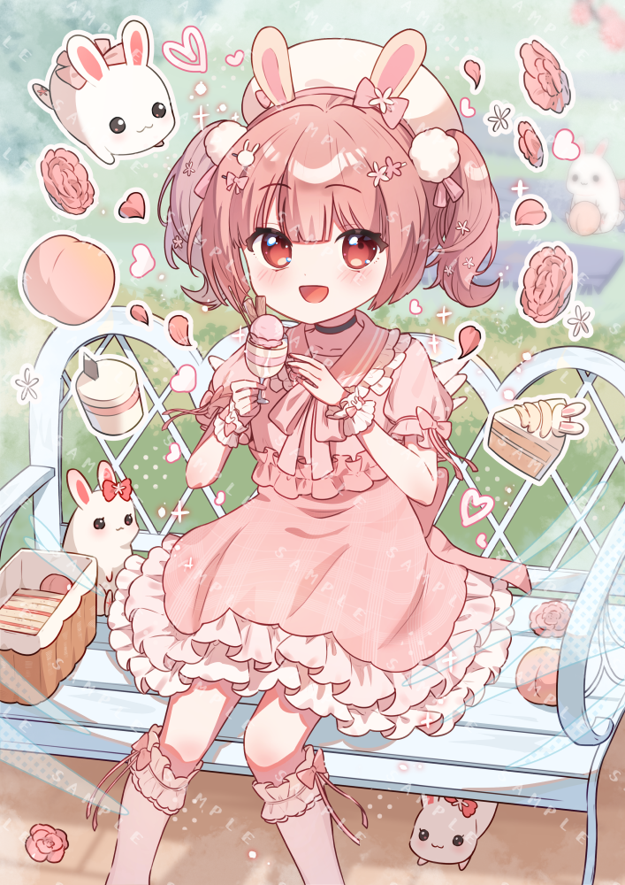 1girl :d animal animal_ears bench black_choker blunt_bangs blush bow bow_legwear bowtie brown_hair choker commentary_request commission cup dress feet_out_of_frame food frilled_dress frilled_socks frills hair_ornament hat holding holding_cup ice_cream indie_virtual_youtuber kneehighs kohanai_momomi looking_at_viewer open_mouth pink_bow pink_bowtie pink_dress pink_socks pom_pom_(clothes) pom_pom_hair_ornament rabbit rabbit_ears rabbit_girl red_eyes short_hair short_sleeves sidelocks sitting skeb_commission sleeve_bow smile socks solo tsukumi_bis twintails virtual_youtuber white_hat