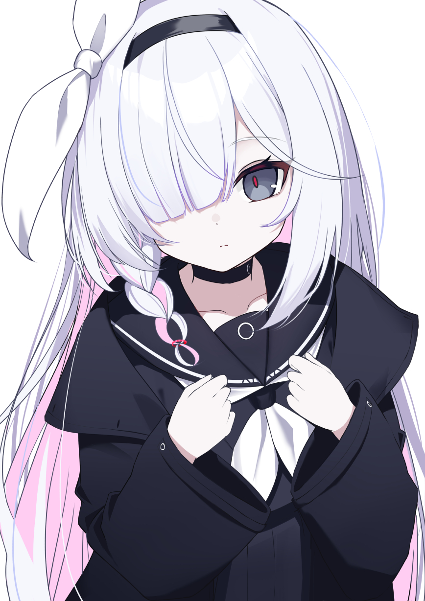 1girl black_choker black_coat black_eyes black_hairband black_sailor_collar black_serafuku blue_archive braid choker coat colored_inner_hair commentary_request hair_over_one_eye hairband highres long_hair long_sleeves looking_at_viewer multicolored_hair neckerchief neko_daruma pink_hair plana_(blue_archive) red_pupils ribbon sailor_collar school_uniform serafuku single_braid skirt solo very_long_hair white_hair white_neckerchief white_ribbon