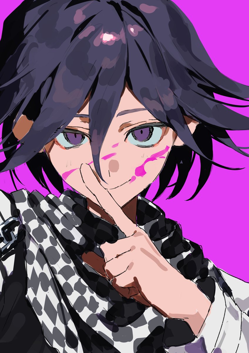 1boy 333takoyaki blood blood_on_face blood_splatter checkered_clothes checkered_scarf commentary commentary_request danganronpa_(series) danganronpa_v3:_killing_harmony flipped_hair hair_between_eyes hand_up index_finger_raised long_sleeves looking_at_viewer male_focus medium_hair oma_kokichi pink_background pink_blood portrait purple_eyes purple_hair scarf short_hair smile smirk smug solo two-tone_scarf