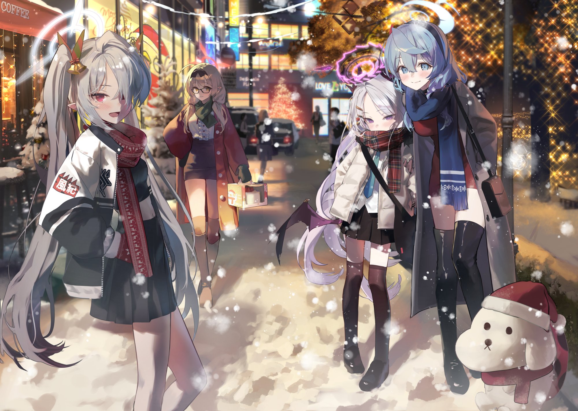 4girls ako_(blue_archive) alternate_costume black_boots black_shoes black_thighhighs blue_archive blue_eyes blue_hair boots brown_hair chinatsu_(blue_archive) commentary demon_horns demon_wings english_commentary ggoc_ill grey_hair hair_between_eyes halo highres hina_(blue_archive) horns iori_(blue_archive) long_hair looking_at_viewer multiple_girls open_mouth outdoors pointy_ears prefect_team_(blue_archive) red_eyes scarf shoes smile standing thigh_boots thighhighs twintails wings winter_clothes winter_uniform