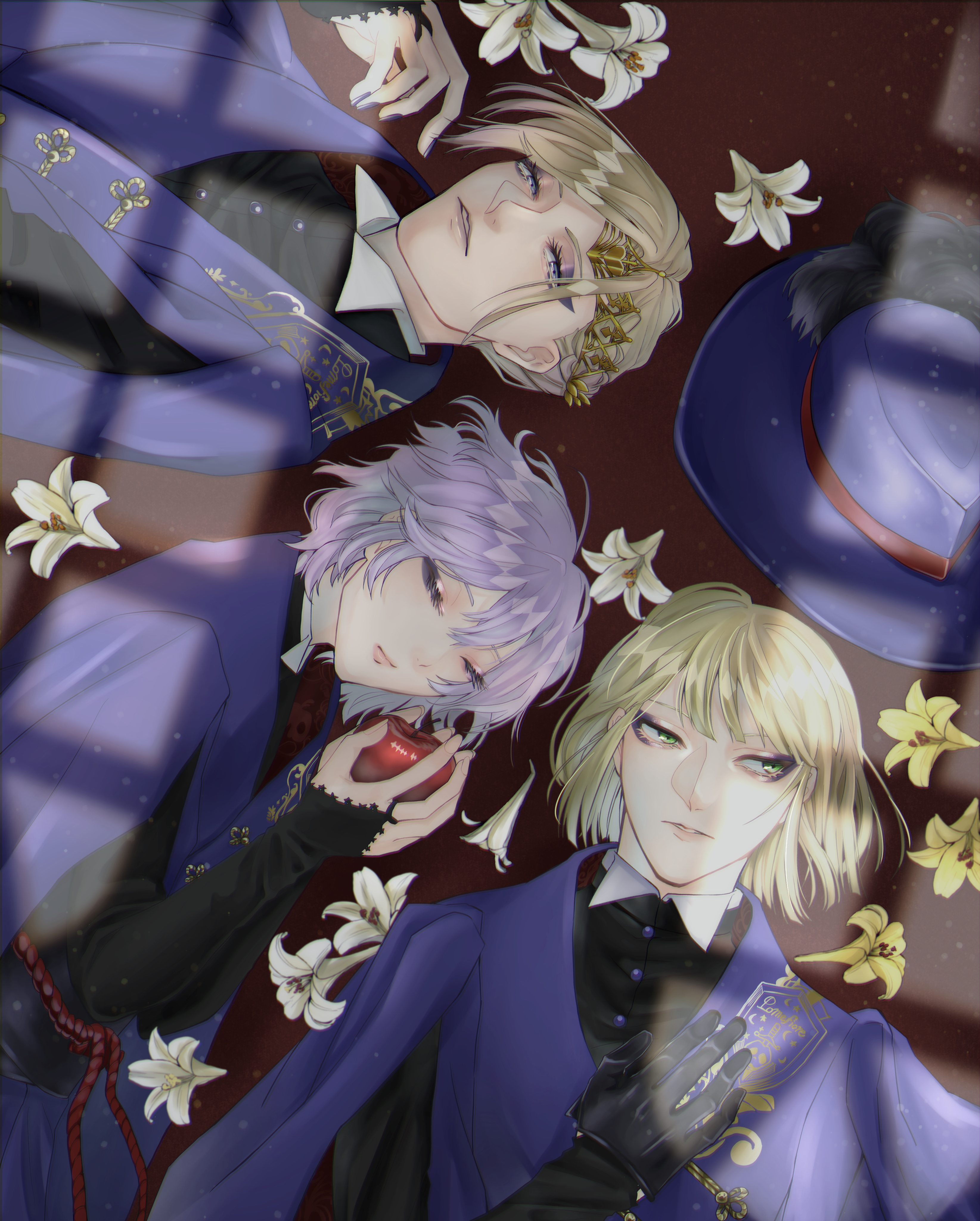 3boys absurdres apple black_bridal_gauntlets black_gloves black_shirt blonde_hair blue_eyes bridal_gauntlets choppy_bangs closed_eyes closed_mouth commentary_request double-parted_bangs epel_felmier flower food fruit gloves green_eyes hat highres holding holding_food holding_fruit jacket long_sleeves looking_at_viewer looking_to_the_side lying male_focus multiple_boys on_back parted_bangs parted_lips pomefiore_dorm pomefiore_dorm_uniform purple_hair purple_hat purple_jacket riemartan rook_hunt shirt short_hair twisted_wonderland vil_schoenheit white_flower yellow_flower