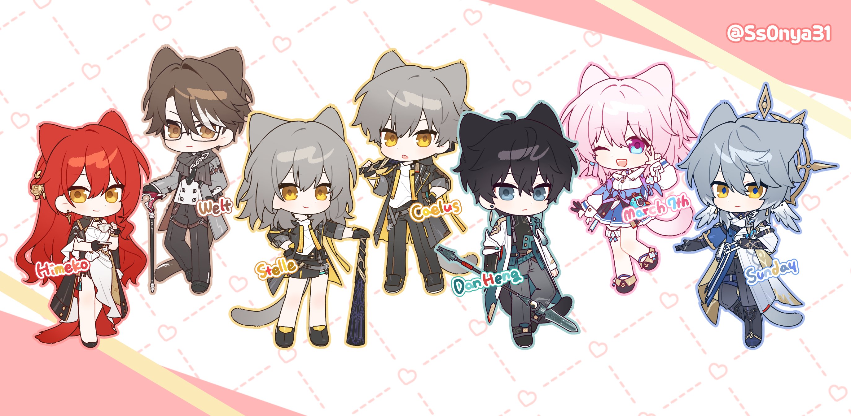 3girls 4boys animal_ears baseball_bat black_gloves black_hair black_jacket black_pants black_skirt blue_eyes blue_skirt brown_eyes brown_hair caelus_(honkai:_star_rail) cane character_name chibi chibi_only coat commentary cup dan_heng_(honkai:_star_rail) dan_heng_(hunt)_(honkai:_star_rail) dress dual_persona full_body glasses gloves green_eyes grey_coat grey_hair grid_background hair_ornament halo halo_behind_head highres himeko_(honkai:_star_rail) holding holding_baseball_bat holding_cane holding_cup holding_polearm holding_weapon honkai:_star_rail honkai_(series) jacket jacket_on_shoulders kemonomimi_mode long_hair long_sleeves looking_at_viewer march_7th_(honkai:_star_rail) march_7th_(preservation)_(honkai:_star_rail) medium_hair multicolored_eyes multiple_boys multiple_girls one_eye_closed pants pink_eyes pink_hair polearm red_hair shirt short_hair skirt spear spiked_halo ss0nya31 stelle_(honkai:_star_rail) sunday_(honkai:_star_rail) untranslatable_commentary tail teacup trailblazer_(honkai:_star_rail) twitter_username two-tone_eyes weapon welt_yang white_dress white_shirt yellow_eyes