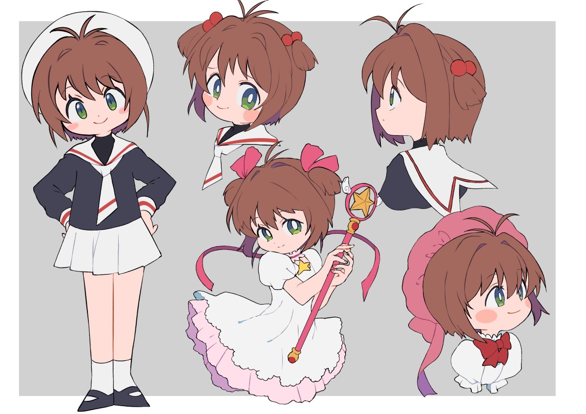 1girl beret black_shirt black_shoes border bow bowtie brown_hair cardcaptor_sakura child choker closed_mouth commentary cropped_head cropped_shoulders dress frilled_choker frills full_body green_eyes grey_background hair_bobbles hair_ornament hair_ribbon hat hat_bow head_tilt holding holding_wand kinomoto_sakura kinomoto_sakura_(astral_sakura) looking_at_viewer looking_to_the_side magical_girl miyata_(lhr) multiple_views outside_border pink_bow pink_choker pink_dress pink_hat pink_ribbon puffy_short_sleeves puffy_sleeves red_bow red_bowtie ribbon sailor_collar shirt shoes short_hair short_sleeves skirt smile socks star_(symbol) turning_head two_side_up wand white_border white_dress white_hat white_sailor_collar white_shirt white_skirt white_socks