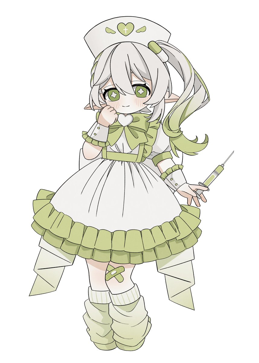 1girl alternate_costume bandaid bandaid_on_knee bandaid_on_leg blush bow bowtie closed_mouth commentary_request dress full_body genshin_impact gradient_hair green_bow green_bowtie green_eyes green_hair hair_between_eyes hand_up hat highres holding holding_syringe kumane_(osakanadonn) long_hair looking_at_viewer multicolored_hair nahida_(genshin_impact) nurse_cap pointy_ears puffy_short_sleeves puffy_sleeves short_sleeves side_ponytail simple_background smile solo standing star-shaped_pupils star_(symbol) symbol-shaped_pupils syringe white_background white_dress white_hair white_wrist_cuffs wrist_cuffs