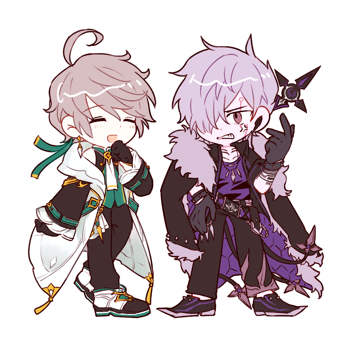 2boys :d ^_^ add_(elsword) ahoge ainchase_ishmael anger_vein arm_tattoo belt belt_buckle black_belt black_coat black_gloves black_pants black_shoes bluhen_(elsword) blush buckle chinese_commentary clenched_teeth closed_eyes coat coat_on_shoulders colored_shoe_soles commentary_request doom_bringer_(elsword) elsword facial_mark full_body fur-trimmed_coat fur_trim gloves green_vest grey_hair hair_over_one_eye hand_on_own_chin hand_on_own_hip hand_up jewelry lie1122 long_sleeves male_focus multiple_boys necklace open_mouth pants purple_eyes purple_hair purple_shirt shirt shoes short_hair simple_background smile tattoo teeth vest white_background white_coat white_shoes