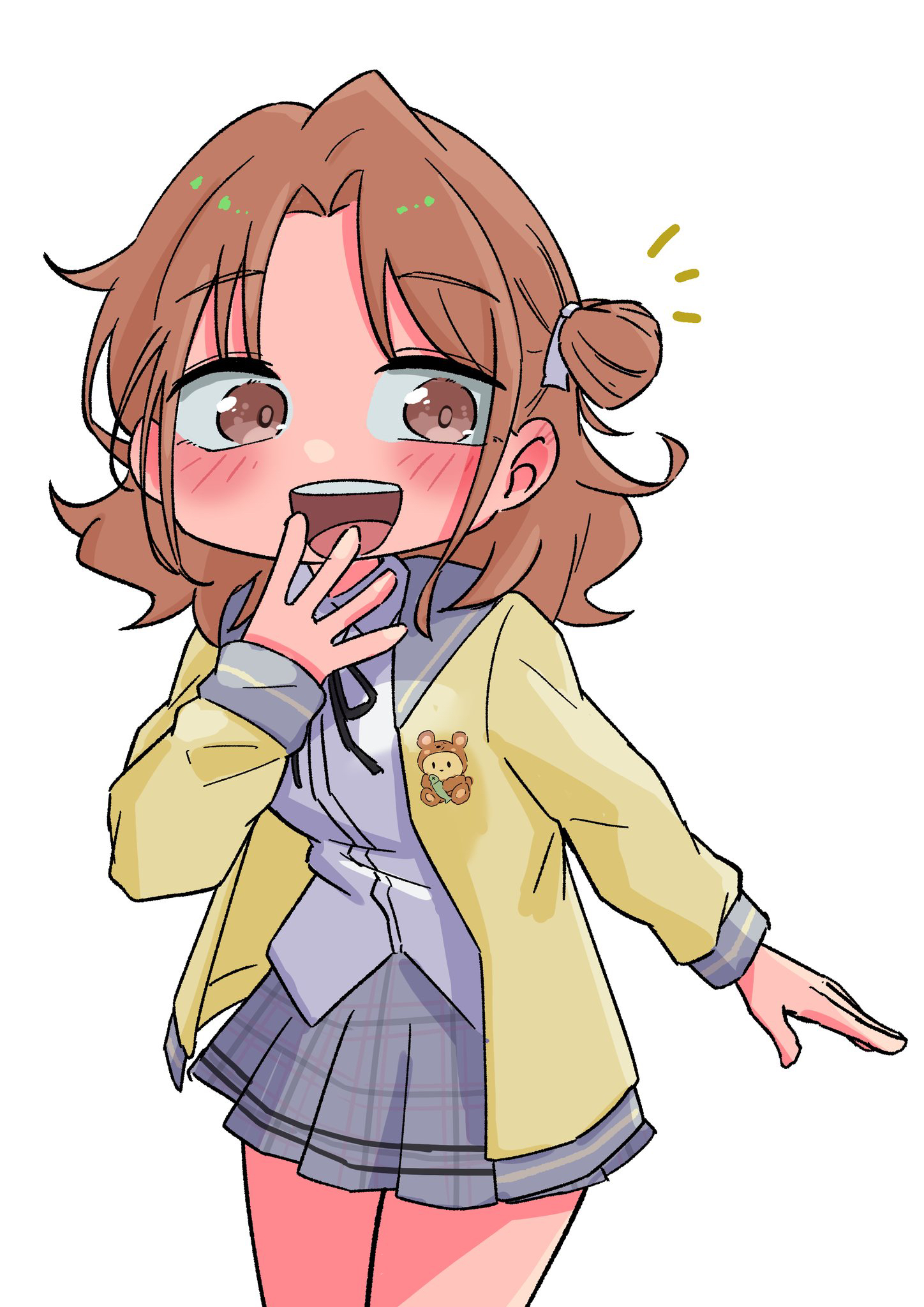 1girl black_ribbon blush brown_hair cardigan commentary_request curtained_hair grey_skirt hair_bun hand_to_own_mouth highres ichikawa_hinana idolmaster idolmaster_shiny_colors looking_at_viewer medium_hair monogataritai neck_ribbon notice_lines pleated_skirt ribbon school_uniform shirt single_side_bun skirt smile solo teeth thighs upper_teeth_only white_shirt yellow_cardigan