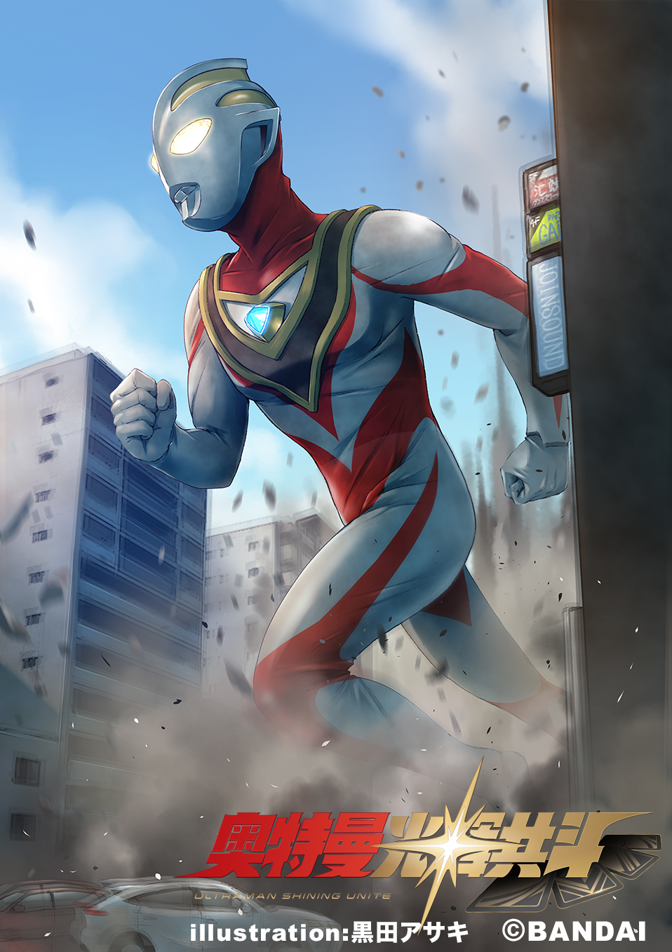 1boy alien armor artist_name bandai blue_sky breastplate building car chinese_commentary city cityscape clenched_hands cloud cloudy_sky color_timer colored_skin commentary compound_eyes copyright_logo copyright_notice day debris dorsal_fin dust_cloud foot_out_of_frame giant giant_male glowing glowing_eyes gold_trim gradient_eyes highres kuroda_asaki logo looking_ahead male_focus mixed-language_commentary motor_vehicle multicolored_eyes multicolored_skin no_pupils official_art outdoors pectorals red_skin running silver_skin sky solo tokusatsu toned toned_male two-tone_skin ultra_series ultraman_gaia ultraman_gaia_(series) white_eyes wrinkled_skin
