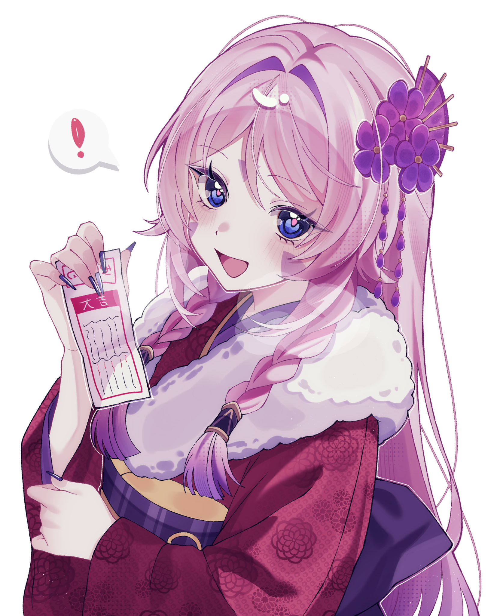 ! 1girl :d alternate_costume blue_eyes braid citlali_(genshin_impact) commentary_request floral_print floral_print_kimono fur-trimmed_kimono fur_trim genshin_impact hair_ornament hand_up highres holding holding_omikuji japanese_clothes kimono long_hair looking_at_viewer multicolored_hair obi omikuji open_mouth pink_hair pink_pupils print_kimono purple_hair purple_sash red_kimono sash simple_background smile solo twin_braids upper_body very_long_hair white_background woolly_(ll_0o0)