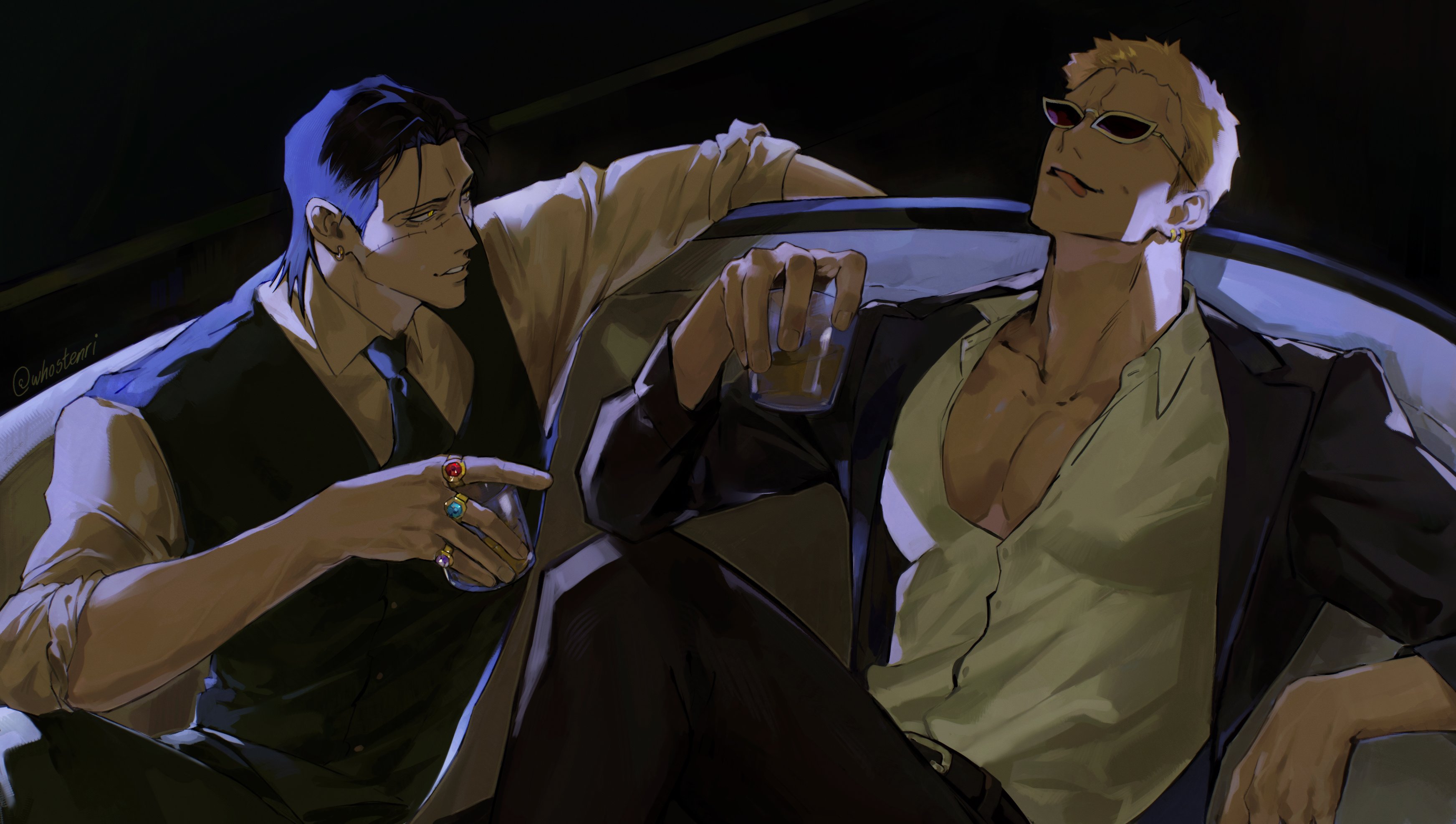 2boys absurdres alcohol arm_rest bare_pectorals belt belt_buckle black_belt black_hair black_jacket black_necktie black_pants black_vest buckle collared_shirt crocodile_(one_piece) cup donquixote_doflamingo drinking_glass elbow_on_knee formal_clothes head_back highres holding holding_cup jacket jewelry lapels long_sleeves male_focus medium_hair multiple_boys multiple_rings necktie notched_lapels one_piece open_clothes open_shirt pants parted_hair pectorals ring shihoritsu shirt short_hair short_sideburns shot_glass sideburns sitting sunglasses tongue tongue_out vest white-framed_eyewear white_shirt wing_collar