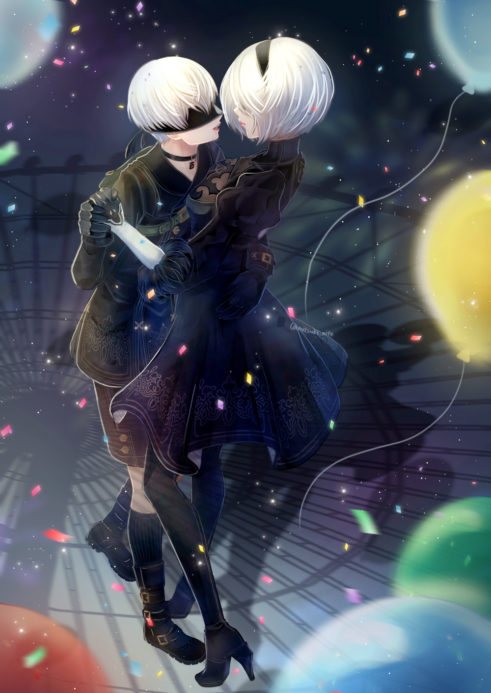 1boy 1girl 2b_(nier:automata) 9s_(nier:automata) arm_around_another's_waist balloon black_boots black_choker black_dress black_gloves black_hairband black_jacket black_shorts blindfold blurry blurry_background boots breasts choker comforting commentary dancing dress english_commentary facing_another feather-trimmed_sleeves from_side full_body gloves hairband hand_on_another's_hip high_heel_boots high_heels highres holding_hands jacket juliet_sleeves lips long_sleeves looking_at_another medium_breasts mitsuki_nite nier:automata nier_(series) open_mouth pink_lips puffy_sleeves short_hair shorts standing thigh_boots turtleneck turtleneck_dress twitter_username white_hair
