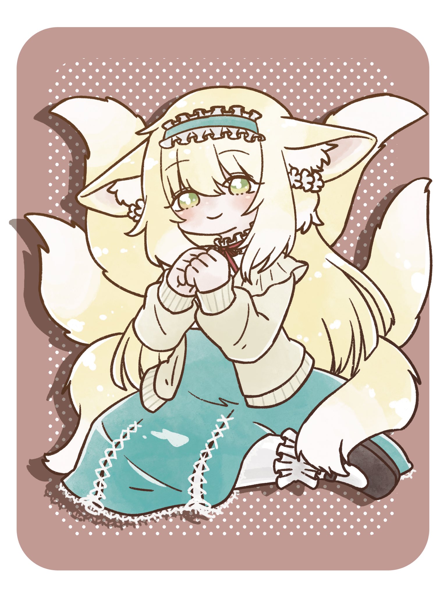 1girl animal_ears arknights blonde_hair cardigan commentary_request fox_ears fox_girl fox_tail frilled_hairband frills green_eyes hairband highres kitsune kyuubi long_hair long_sleeves multiple_tails neck_ribbon nunnuje_a_u_e official_alternate_costume one-hour_drawing_challenge open_cardigan open_clothes ribbon shoes skirt solo suzuran_(arknights) suzuran_(spring_praise)_(arknights) tail yellow_cardigan