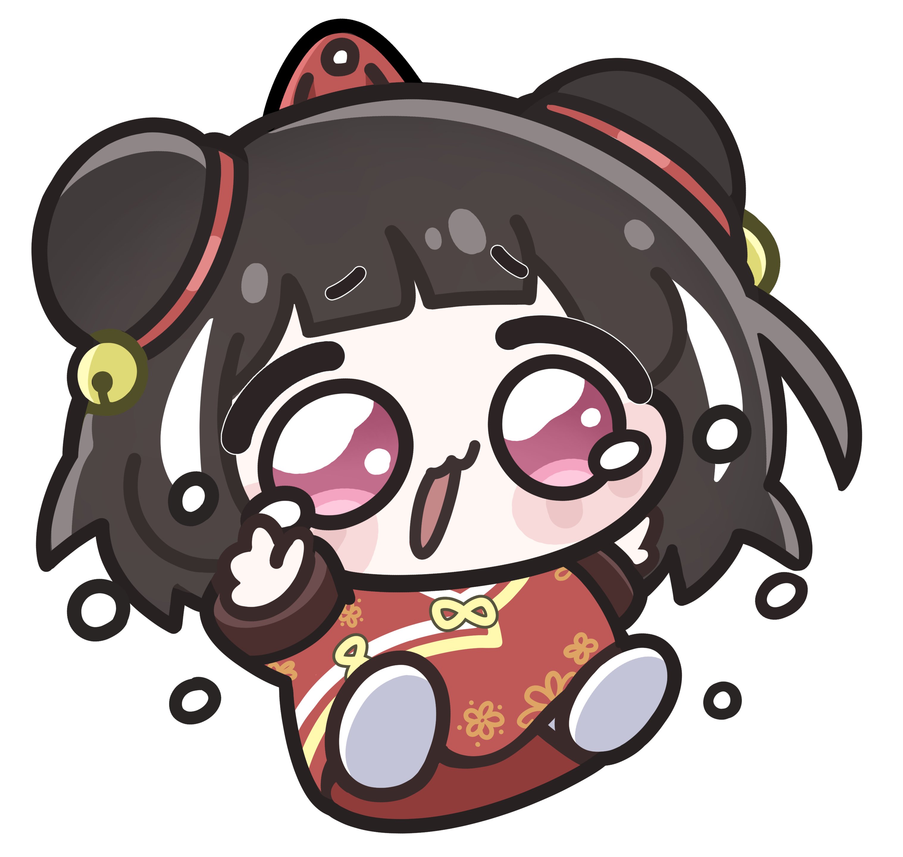 1girl absurdres black_hair chibi dress hands_up hashtag-only_commentary highres jia_xichun_(project_moon) jogigae3706 limbus_company long_sleeves multicolored_hair project_moon red_dress shoes short_hair simple_background solo streaked_hair white_background white_shoes white_streaks