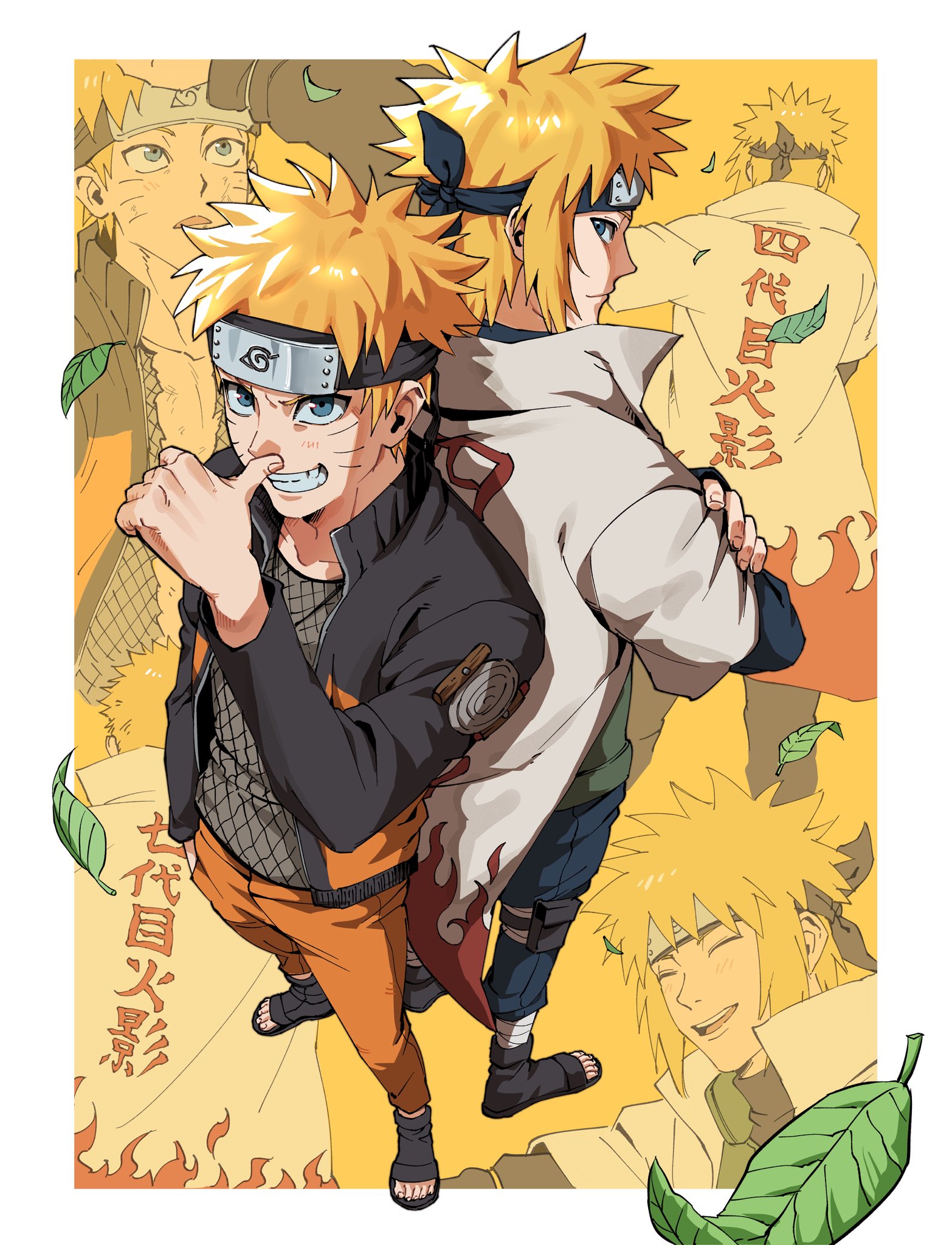 1bhhq 2boys back-to-back black_jacket blonde_hair blue_eyes border closed_mouth coat commentary crossed_arms facial_mark fishnet_top fishnets forehead_jewel forehead_protector full_body highres jacket leaf male_focus multiple_boys namikaze_minato naruto_(series) naruto_shippuuden orange_jacket orange_vest parted_lips short_hair smile smirk untranslatable_commentary uzumaki_naruto vest whisker_markings white_border white_coat yellow_background