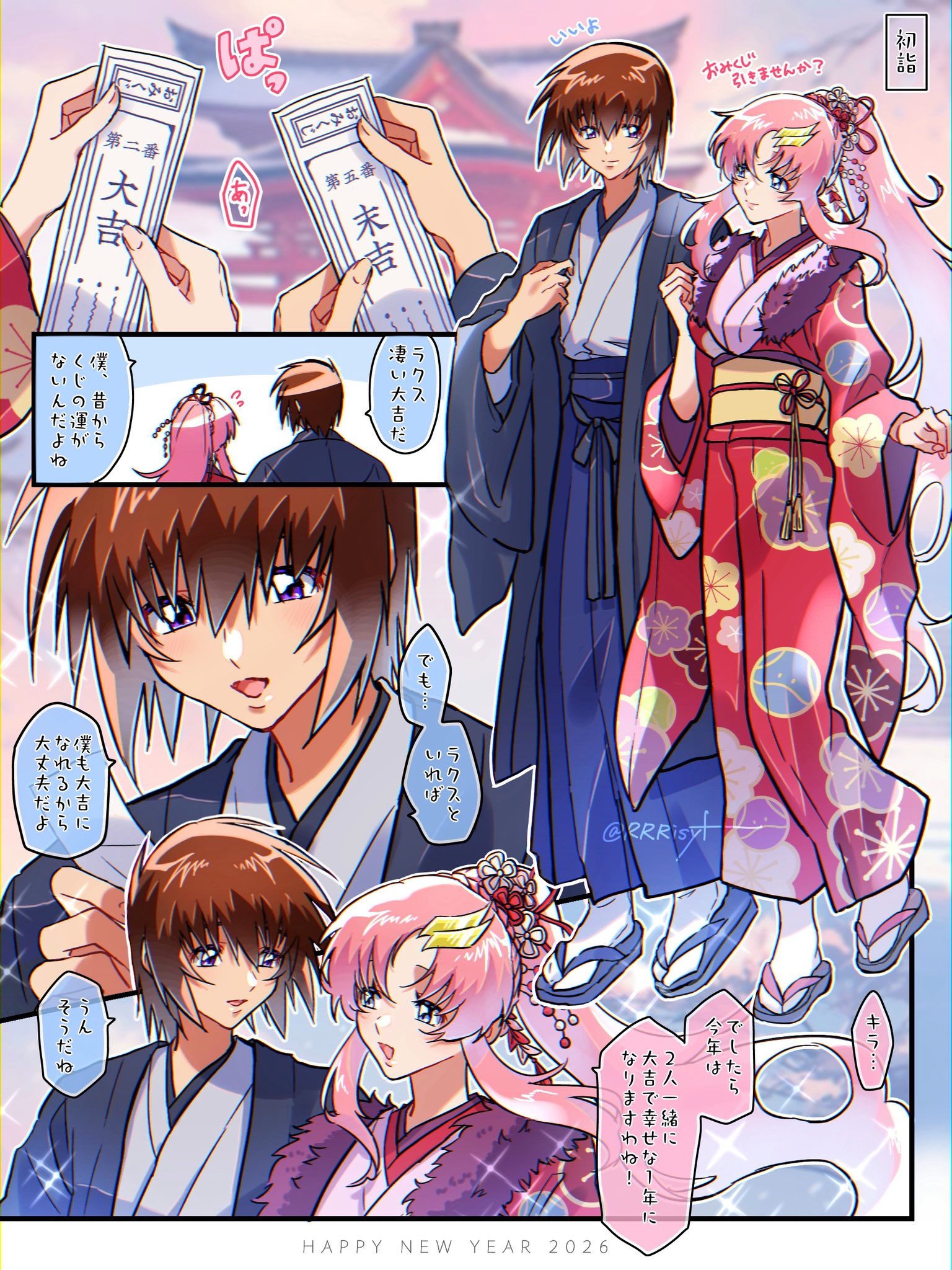 1boy 1girl 2026 architecture black_haori blue_hakama blurry blurry_background brown_hair commentary_request east_asian_architecture floral_print floral_print_kimono flower full_body fur-trimmed_kimono fur_trim furisode gundam gundam_seed hair_between_eyes hair_flower hair_ornament hairclip hakama haori happy_new_year highres japanese_clothes kimono kira_yamato lacus_clyne long_hair new_year open_mouth parted_bangs parted_lips pink_hair ponytail print_kimono purple_eyes reading red_kimono rrrisyf sandals short_hair shrine sidelocks smile tabi twitter_username
