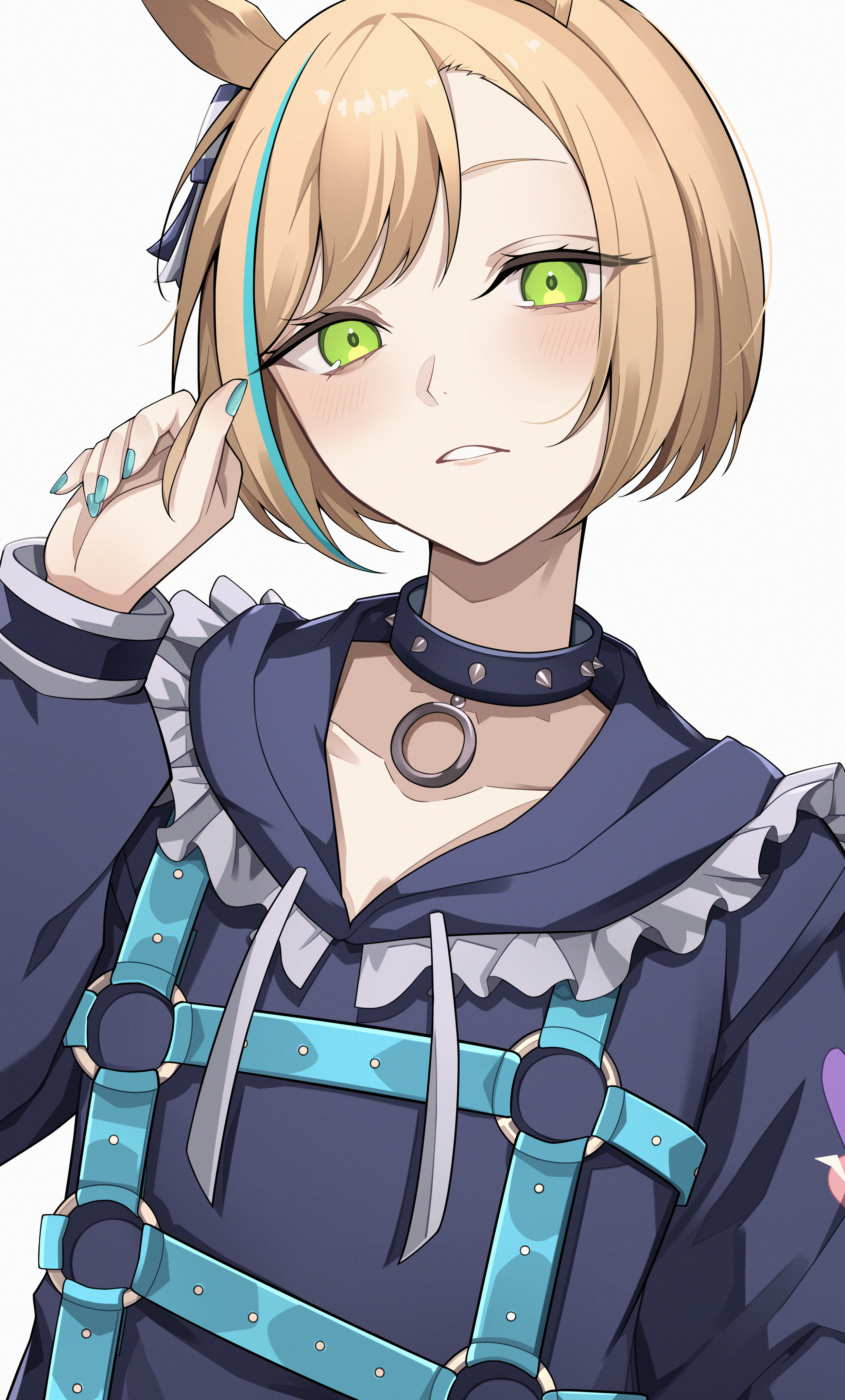 absurdres animal_ears blonde_hair blue_dress blue_hair blue_nails blue_sailor_collar blush bow choker collar collarbone commentary dress english_commentary frilled_sailor_collar frills green_eyes hair_bow highres horse_ears horse_girl little_cocon_(umamusume) long_sleeves looking_at_viewer multicolored_hair nurufufufu parted_lips pendant_choker sailor_collar short_hair spiked_choker spiked_collar spikes strap streaked_hair umamusume