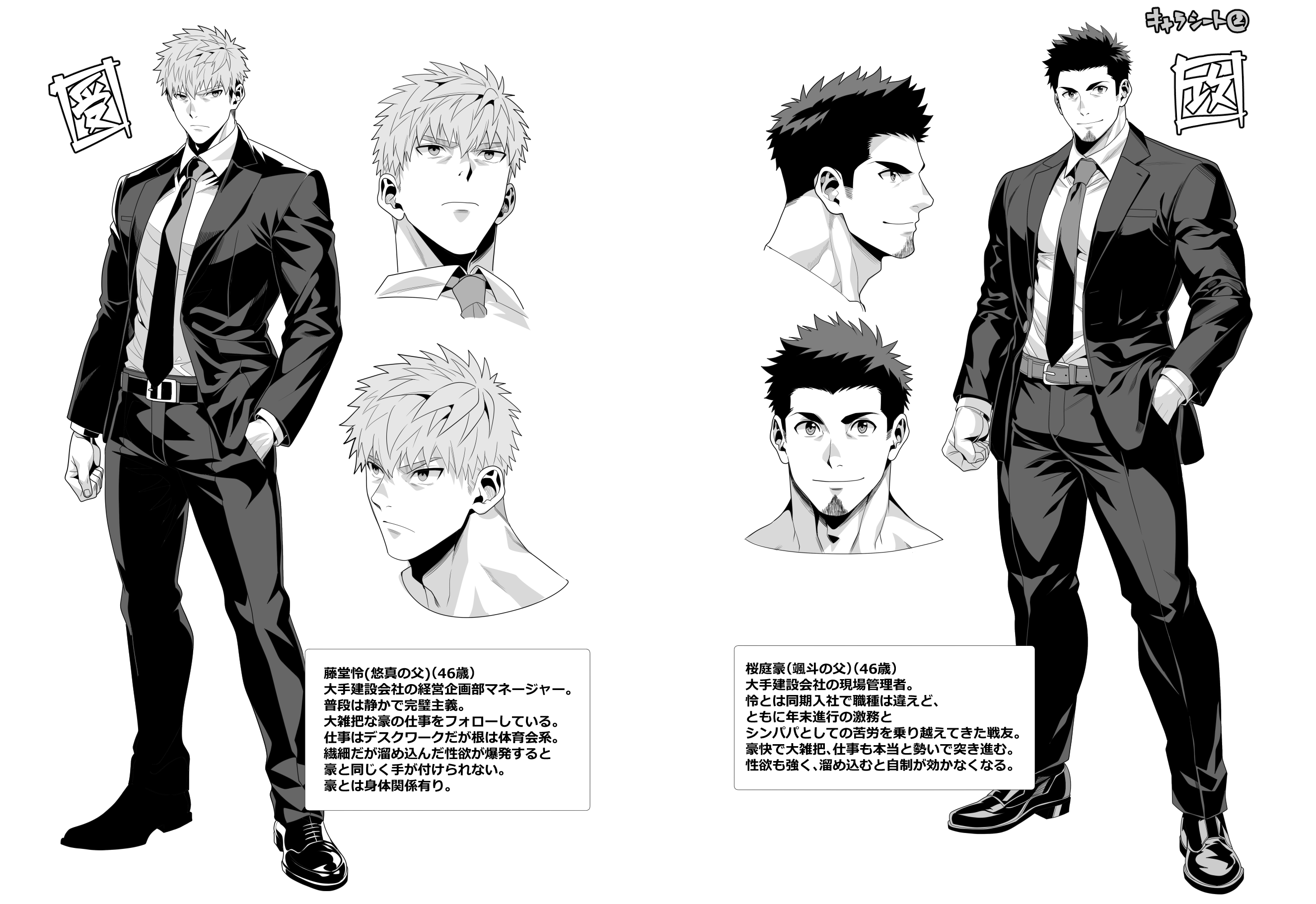 2boys bara belt clenched_hand collared_shirt commentary_request dress_pants dress_shoes facial_hair formal_clothes goatee_stubble greyscale hand_in_pocket hifumi_(3b_x) highres looking_at_viewer male_focus monochrome multiple_boys muscular muscular_male necktie original reference_sheet shirt simple_background spiked_hair stubble suit thick_arms thick_eyebrows thick_thighs thighs translation_request white_background