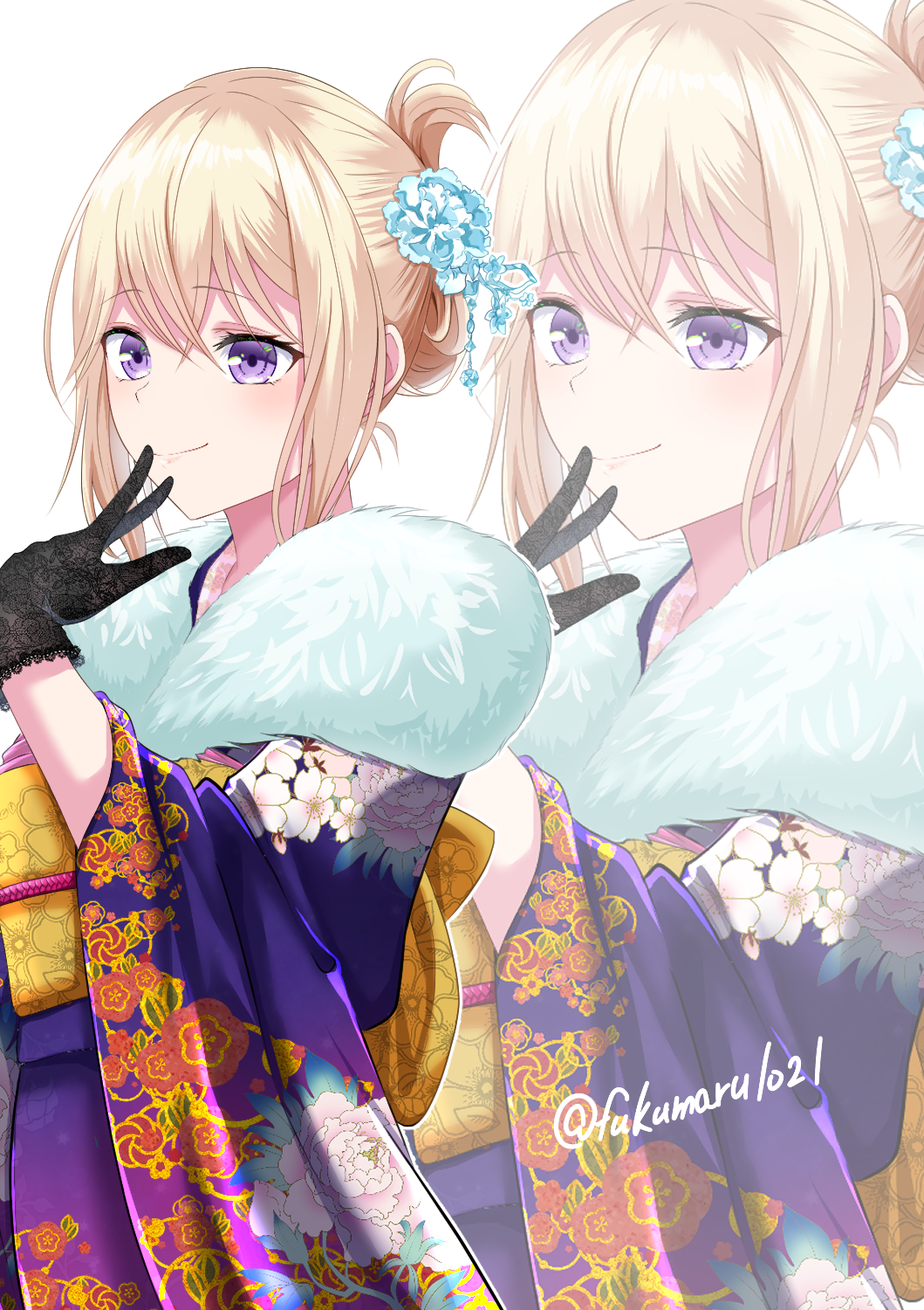 1girl bang_dream! bang_dream!_it's_mygo!!!!! black_gloves blonde_hair closed_mouth commentary floral_print floral_print_kimono folded_ponytail fukumaru1021 gloves hair_between_eyes highres japanese_clothes kimono lace lace_gloves medium_hair misumi_uika print_kimono purple_eyes purple_kimono sash sidelocks solo yellow_sash zoom_layer