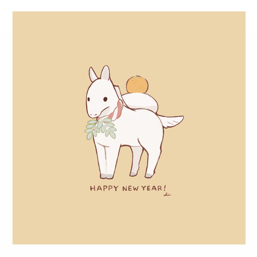 1other black_eyes brown_background chai_(drawingchisanne) chinese_zodiac food fruit happy_new_year hooves horse mandarin_orange mochi new_year no_humans original signature solo white_fur year_of_the_horse