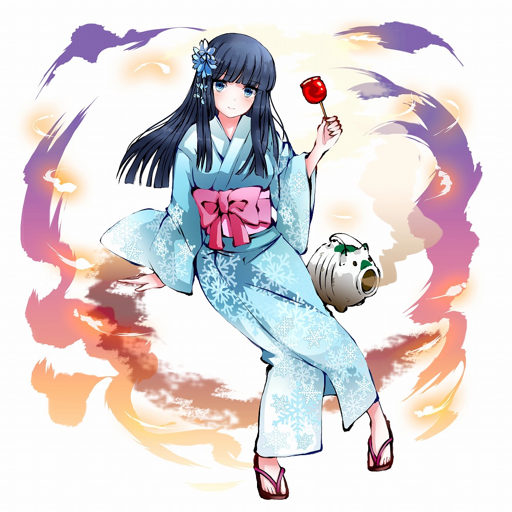1girl arm_support black_hair blue_eyes blue_flower blunt_bangs blush bow breasts candy_apple closed_mouth crossover flower food hair_flower hair_ornament himegami_kagura holding holding_food japanese_clothes kimono long_hair looking_at_viewer mahouka_koukou_no_rettousei medium_breasts obi official_art pink_bow sandals sash second-party_source shiba_miyuki simple_background sitting smile solo white_background yukata zouri