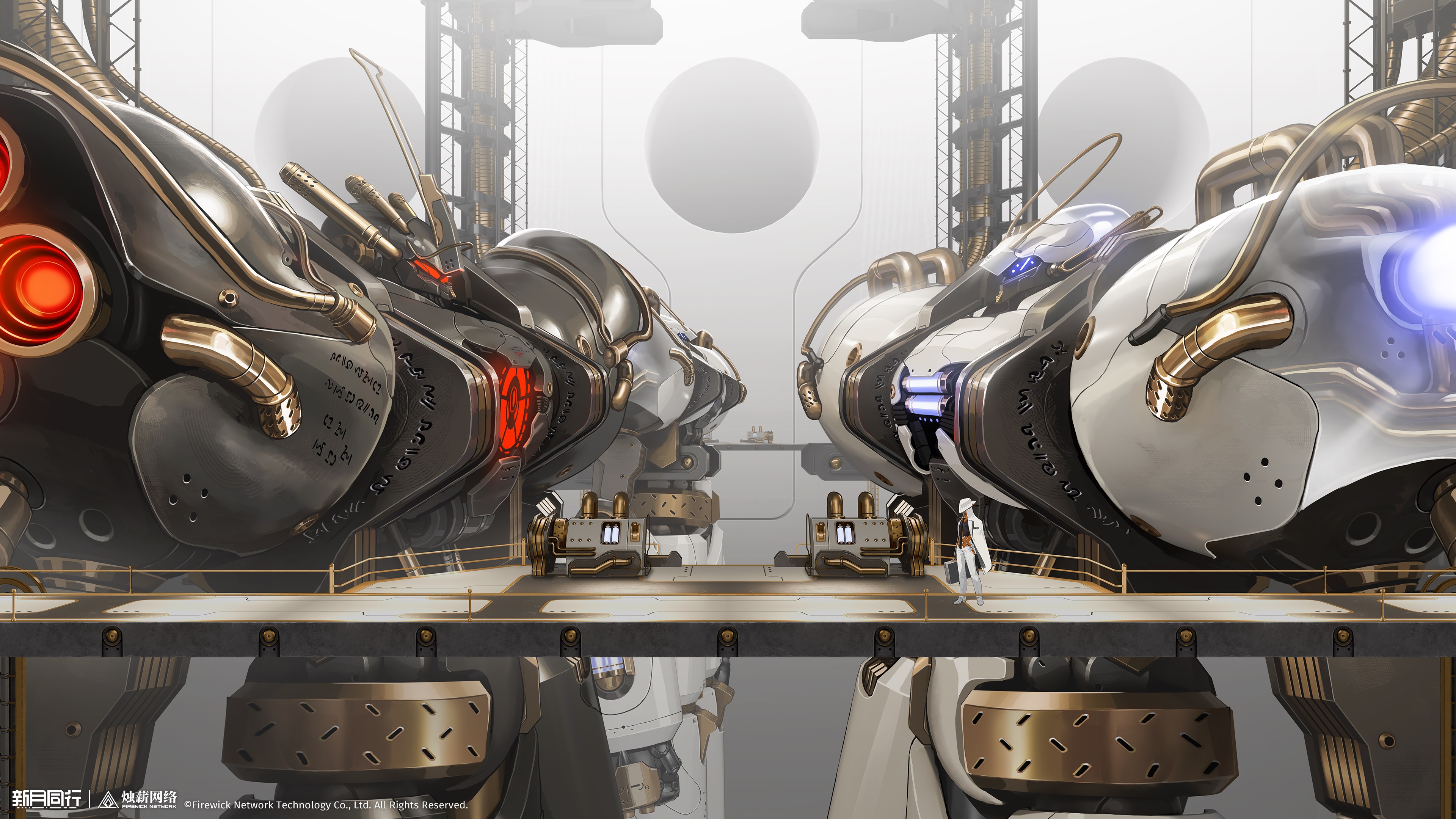 1other absurdres black_shirt coat copyright_name copyright_notice group_leader_(xinyue_tongxing) hat highres indoors logo mecha mecha_focus official_art official_wallpaper pants robot science_fiction shirt standing very_wide_shot white_coat white_hat white_pants xinyue_tongxing