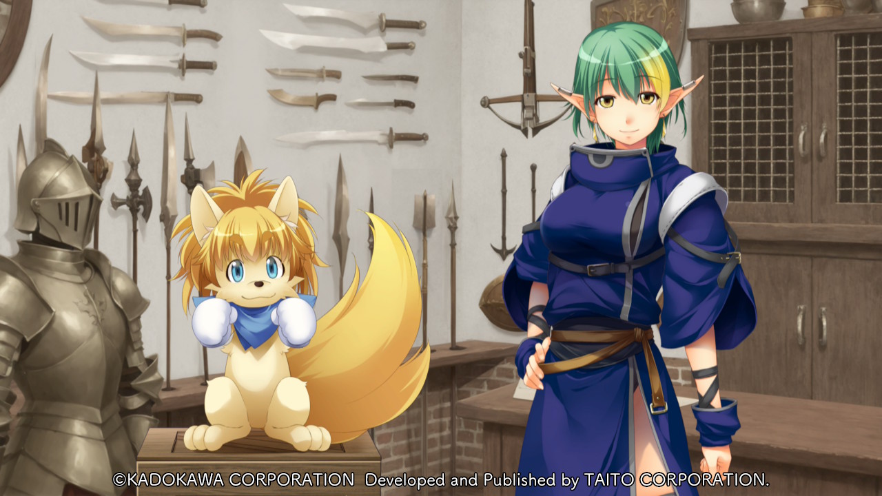 1girl animal_ears animal_nose armor atelier-moo belt blonde_hair blue_eyes blue_scarf body_fur bow_(weapon) breasts brown_fur clenched_hands closed_mouth colored_tips company_name copyright_notice creature crossbow dagger day dog_ears dog_tail earrings elf elle_louise full_armor game_cg gloves green_hair hair_between_eyes halberd hand_on_own_hip indoors jewelry knife large_breasts large_variant_set looking_at_viewer medium_hair multicolored_hair non-web_source pointy_ears polearm scarf shield shop short_hair short_sleeves smile spear standing sword tail teddy_(yuukyuu_gensoukyoku) thick_eyebrows thighs variant_set weapon white_gloves wooden_box yellow_eyes yuukyuu_gensoukyoku yuukyuu_gensoukyoku_revival
