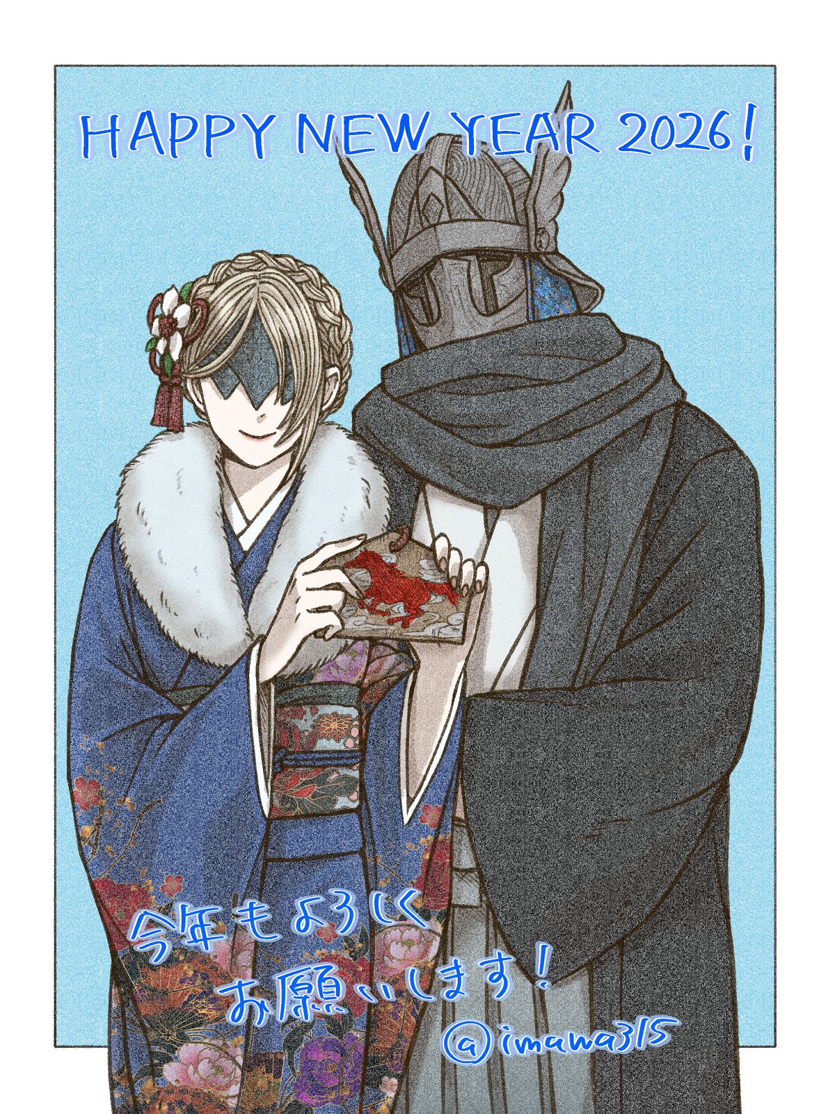 1boy 1girl blonde_hair blue_background border braid crown_braid duchess_(elden_ring) elden_ring elden_ring_nightreign ema eye_mask floral_print flower fur_trim hair_flower hair_ornament happy_new_year helmet highres holding holding_ema horse imawa315 japanese_clothes mask new_year parted_bangs short_hair simple_background smile white_border winged_helmet wylder_(elden_ring)