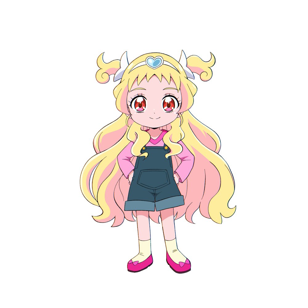 1girl @est@ aged_up blonde_hair blue_overalls bow chibi child closed_mouth eyelashes full_body hair_ornament hairband hands_on_own_hips heart heart_hair_ornament hug-tan_(precure) hugtto!_precure long_hair long_sleeves looking_at_viewer overall_shorts overalls pink_shirt precure red_eyes shirt shoes sidelocks simple_background smile socks solo standing straight-on transparent_background two_side_up very_long_hair white_background white_hairband yellow_socks