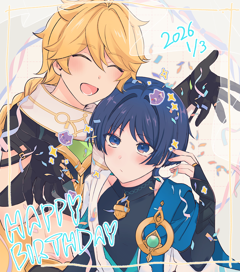 2boys aether_(genshin_impact) ahoge aqua_gem birthday black_gloves black_shirt blonde_hair blue_cape blue_eyes blue_hair blunt_ends braid bridal_gauntlets cape closed_eyes closed_mouth commentary_request confetti covered_collarbone dated english_text eyeshadow fingernails gem genshin_impact gloves gold_ring gold_trim hair_between_eyes han'eri hand_up hands_up happy happy_birthday long_hair looking_at_another looking_up low-braided_long_hair low-tied_long_hair makeup male_focus mandarin_collar midriff multiple_boys missing_headwear open_clothes open_mouth open_vest parted_bangs pom_pom_(clothes) red_eyeshadow scaramouche_(cat)_(genshin_impact) scaramouche_(genshin_impact) scarf shirt short_hair short_sleeves shougo_kota simple_background single_braid sleeveless sleeveless_shirt smile star_(symbol) teeth vest vision_(genshin_impact) wanderer_(genshin_impact) white_background white_scarf white_vest