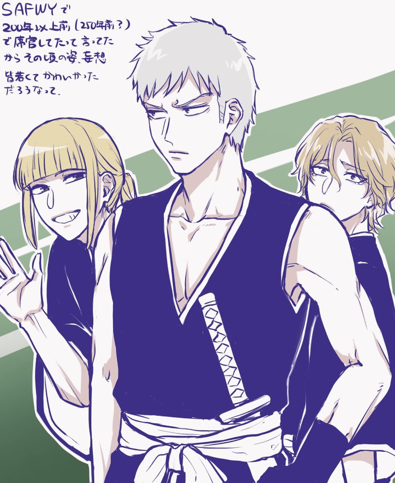 1046sstep_btoh 3boys alternate_hairstyle bleach blonde_hair commentary_request frown grey_hair grin hair_between_eyes hirako_shinji male_focus muguruma_kensei multiple_boys ootoribashi_roujuurou pectoral_cleavage pectorals ponytail shihakusho sidelocks sleeveless smile sword translation_request waving weapon