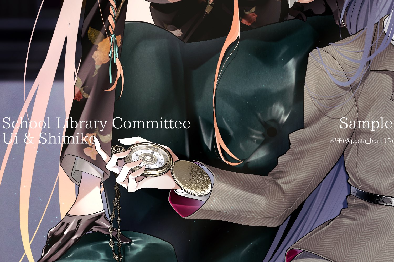2girls artist_name belt black_belt black_gloves black_hair blue_archive braid brown_coat character_name coat collared_shirt comiket_107 commentary_request couch cropped floral_print gloves hair_over_shoulder head_out_of_frame holding holding_pocket_watch lapels layered_sleeves leaning_forward long_hair multiple_girls notched_lapels on_couch orange_hair pasta_bar415 pocket_watch sample_watermark shimiko_(blue_archive) shirt sitting solo ui_(blue_archive) very_long_hair watch watermark white_shirt