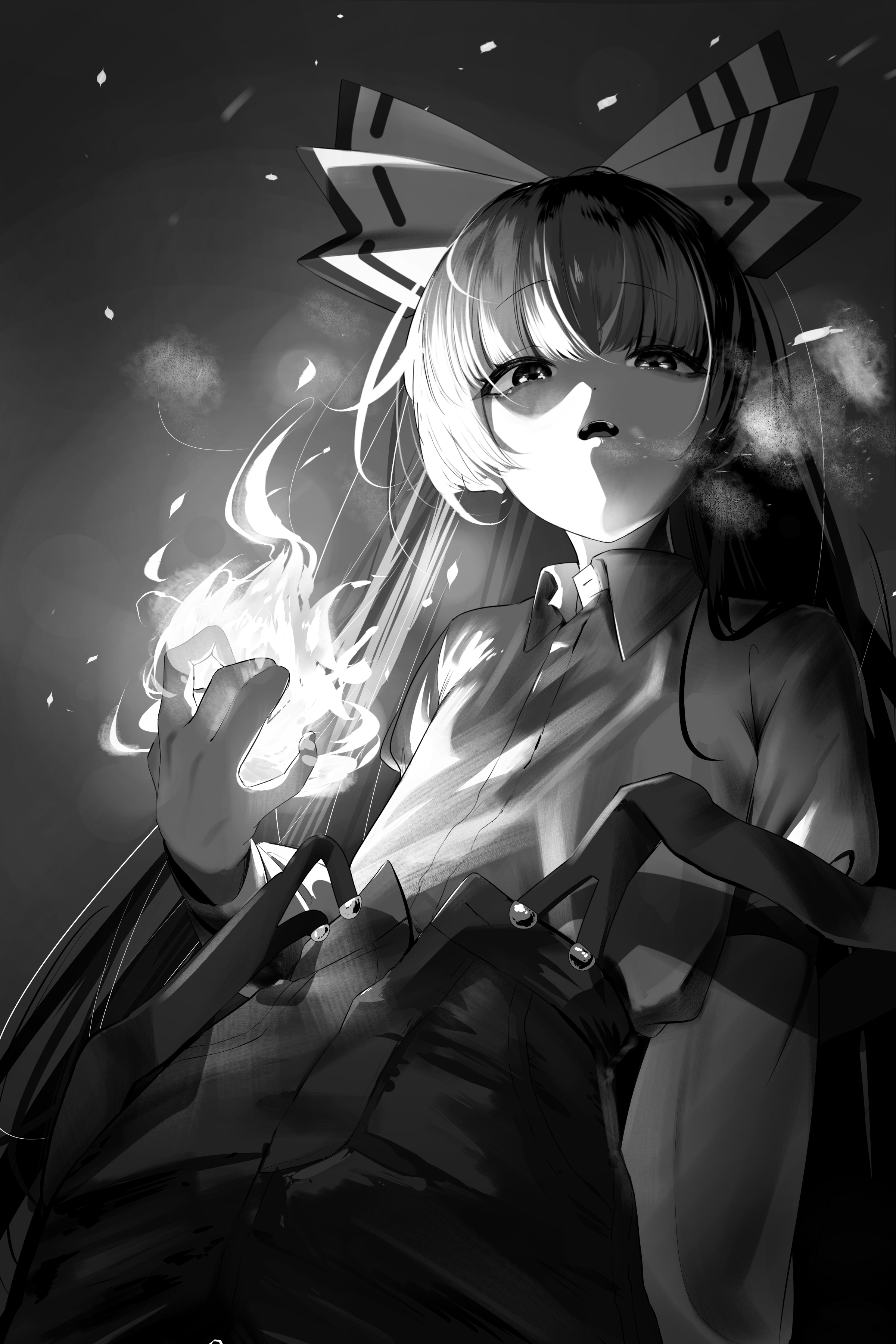 1girl absurdres bow collared_shirt fire flat_chest fujiwara_no_mokou greyscale hair_bow highres long_hair long_sleeves looking_at_viewer looking_down mira_mira_mira monochrome pants pyrokinesis shirt solo suspenders touhou two-tone_bow