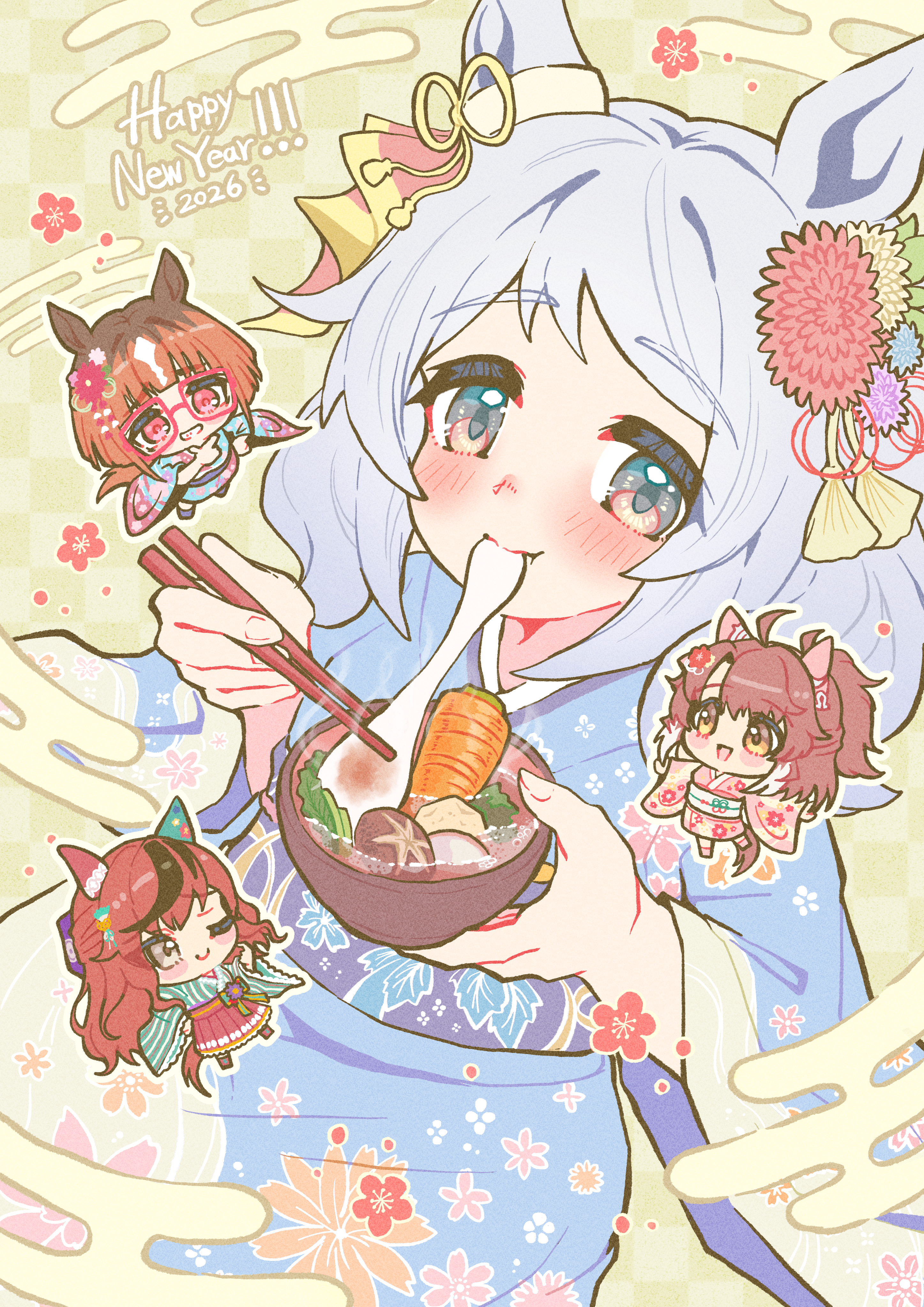 4girls absurdres ahoge animal_ears blue_kimono blush bowl breasts brown_eyes brown_hair chibi chopsticks closed_mouth dantsu_flame_(umamusume) ear_covers ear_flower ear_ornament floral_print floral_print_kimono food glasses green_kimono grey_hair hair_ornament hairband happy_new_year highres hishi_miracle_(umamusume) holding holding_bowl holding_chopsticks horse_ears horse_girl horse_tail japanese_clothes kimono long_sleeves looking_at_viewer medium_hair mismatched_ear_covers mochi mochi_trail multicolored_hair multiple_girls nenbutsu_0416 new_year nice_nature_(umamusume) obi one_eye_closed open_mouth pink_hairband pink_kimono print_kimono red-framed_eyewear red_eyes red_skirt sash short_hair skirt smile streaked_hair tail transcend_(umamusume) umamusume white_hair wide_sleeves