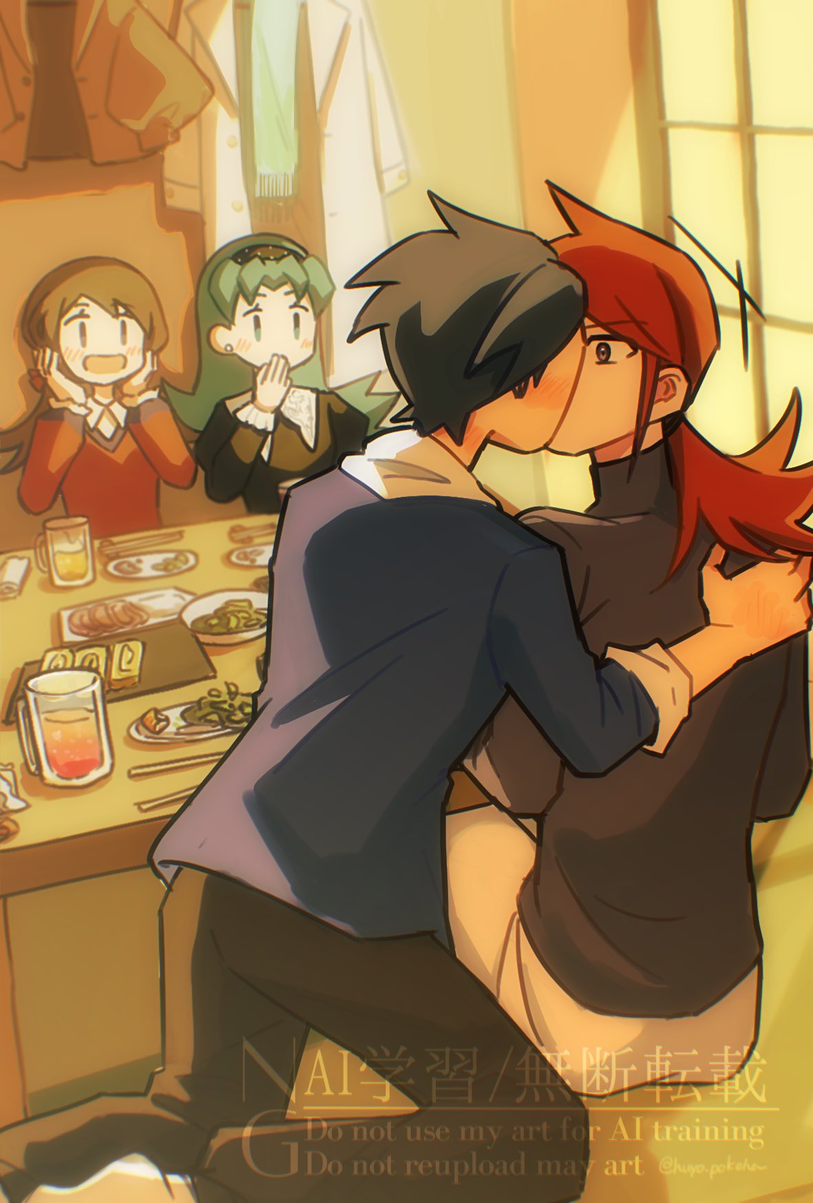 2boys 2girls black_hair black_pants black_shirt blue_shirt blush drink ethan_(pokemon) flipped_hair food hair_slicked_back hand_on_another's_shoulder highres indoors juliet_sleeves kiss kneeling kris_(pokemon) long_sleeves low_ponytail lyra_(pokemon) male_focus multiple_boys multiple_girls nintendo pants pokemon pokemon_gold/silver/crystal pokemon_heartgold_and_soulsilver ponytail puffy_sleeves red_hair red_shirt ribi001_(huyo_poke) shirt silver_(pokemon) sitting surprised turning_head turtleneck turtleneck_shirt twintails white_pants yaoi |_|