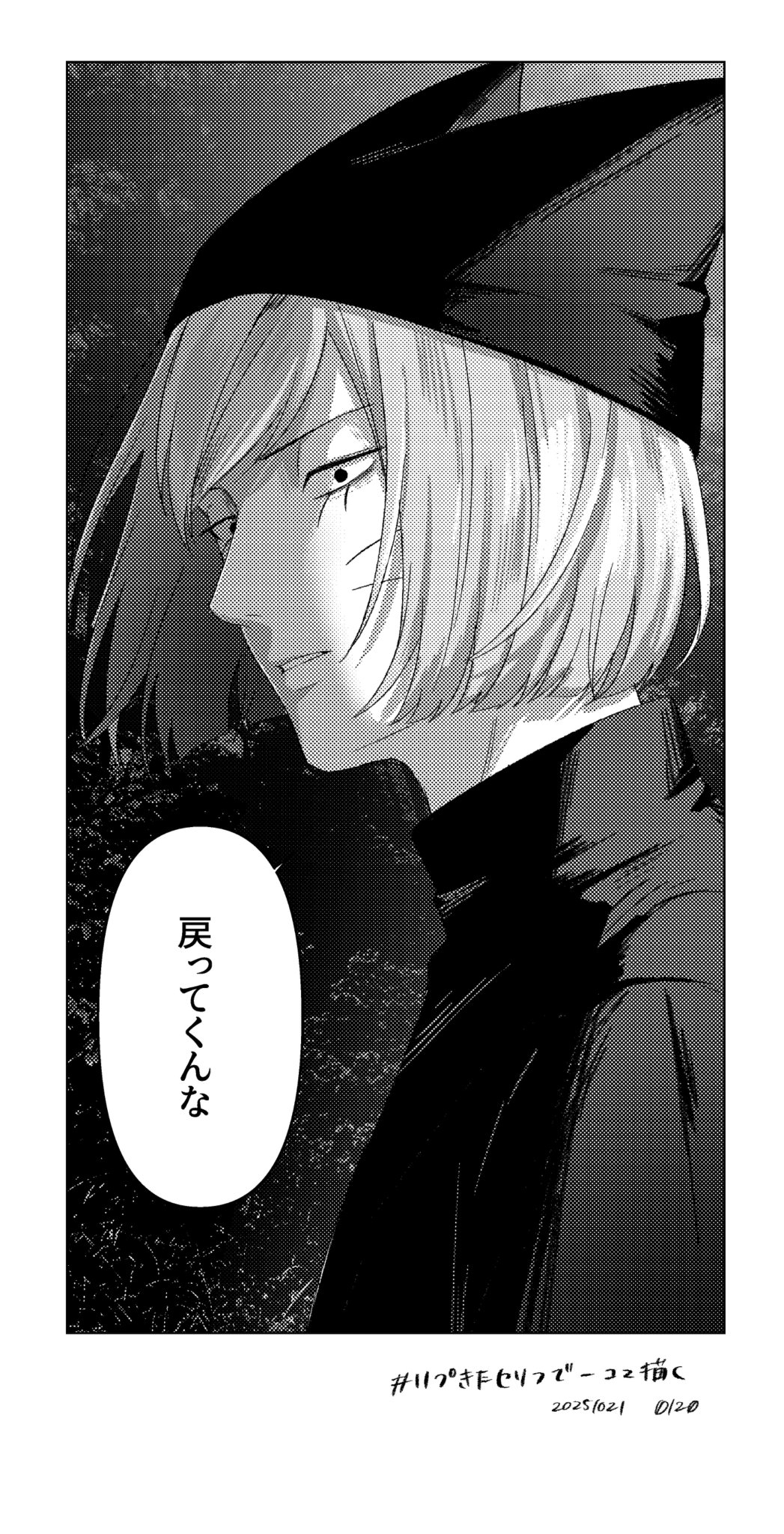 1boy animal_hat border cat_hat commentary_request dated facial_mark greyscale hat highres looking_at_viewer male_focus monochrome nil_(pixiv_53614557) nyen_(randal's_friends) parted_lips randal's_friends short_hair simple_background solo speech_bubble translation_request whisker_markings white_border