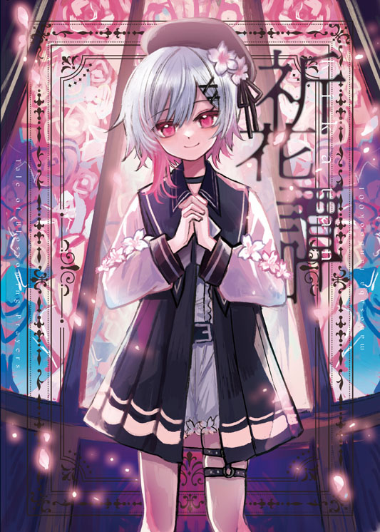 1girl beret black_choker black_dress black_hat cherry_blossoms choker commentary_request cowboy_shot dress flower gradient_hair grey_hair hair_flower hair_ornament hat interlocked_fingers light_particles long_sleeves looking_at_viewer mahou_shoujo_no_majo_saiban multicolored_hair musica_musica o-ring o-ring_thigh_strap own_hands_together pink_eyes pink_hair sakuraba_ema short_hair shorts smile solo stained_glass standing thigh_strap translation_request white_flower white_shorts x_hair_ornament