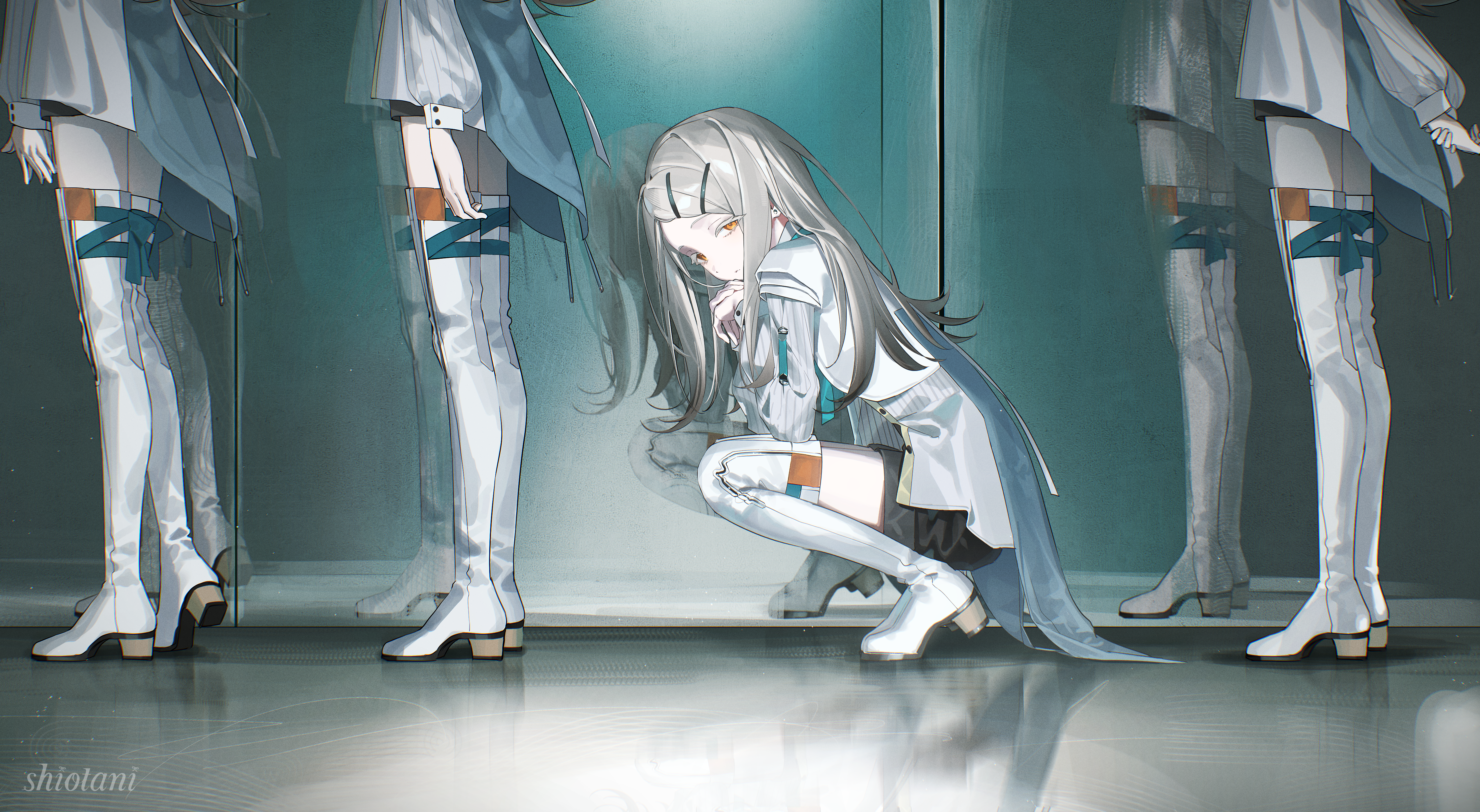 4girls absurdres artist_name black_shorts boots closed_mouth colored_eyelashes commentary_request earrings flipped_hair from_side full_body gakuen_idolmaster gradient_hair grey_hair hair_ornament hairclip hajime_(idolmaster) head_on_hand head_rest high_heel_boots high_heels highres idolmaster jewelry long_hair long_sleeves looking_at_viewer multicolored_hair multiple_girls multiple_persona orange_eyes parallel_hairclips parted_bangs reflection shinosawa_hiro shirt shorts siotanikun squatting standing stud_earrings thigh_boots white_boots white_shirt