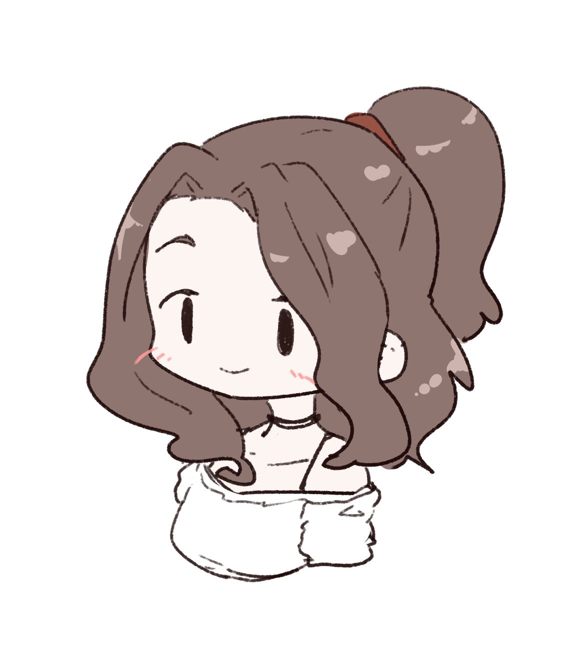 1girl bare_shoulders black_eyes blush breasts brown_hair closed_mouth cropped_torso deformed highres long_hair looking_ahead mitsuha-chan_(olto_rondo) olto_rondo original shirt simple_background smile solo white_background white_shirt |_|