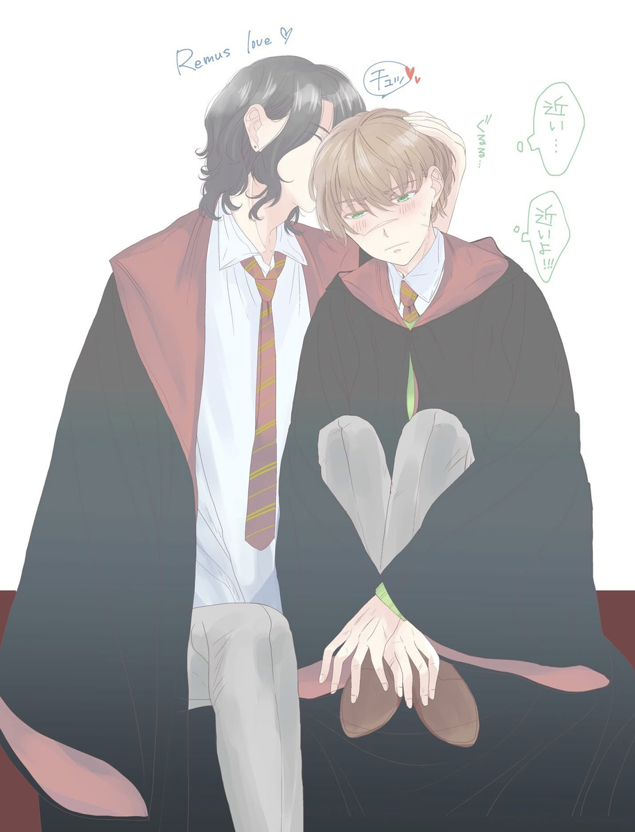 2boys adam's_apple black_hair black_robe blush brown_hair character_name closed_eyes closed_mouth collar english_text eyebrows_hidden_by_hair green_eyes hand_on_another's_head harry_potter_(series) heart highres hogwarts_school_uniform japanese_text legs_together legs_up male_focus medium_hair multiple_boys necktie pixiv_id_3606460 remus_lupin robe scar scar_on_face scar_on_nose school_uniform shirt shoes short_hair simple_background sirius_black sitting speech_bubble sweat sweatdrop white_background white_shirt wing_collar wizarding_world yaoi