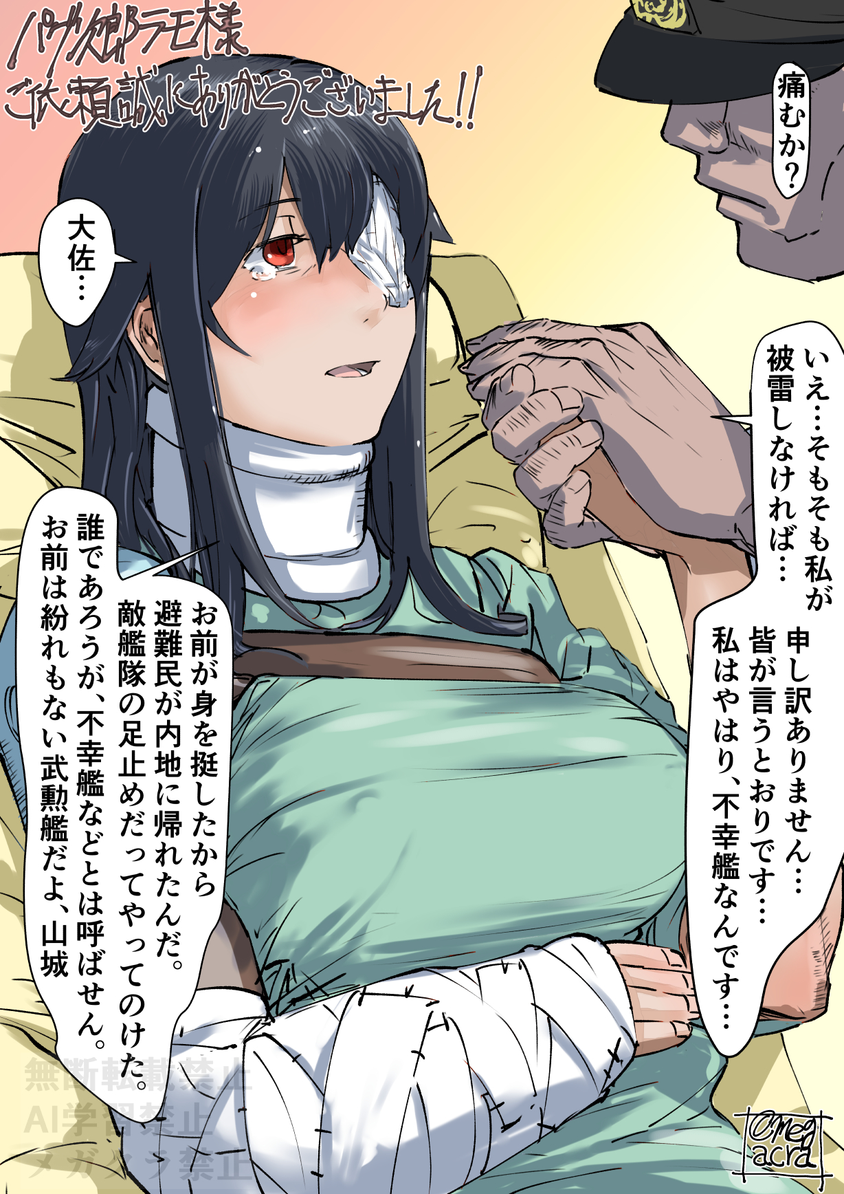 1boy 1girl admiral_(kancolle) alternate_costume arm_cast black_hair cast commentary_request commission eyepatch highres hospital_gown kantai_collection long_hair lying megakura_kinshi neck_brace red_eyes skeb_commission solo_focus tears translation_request upper_body yamashiro_(kancolle)