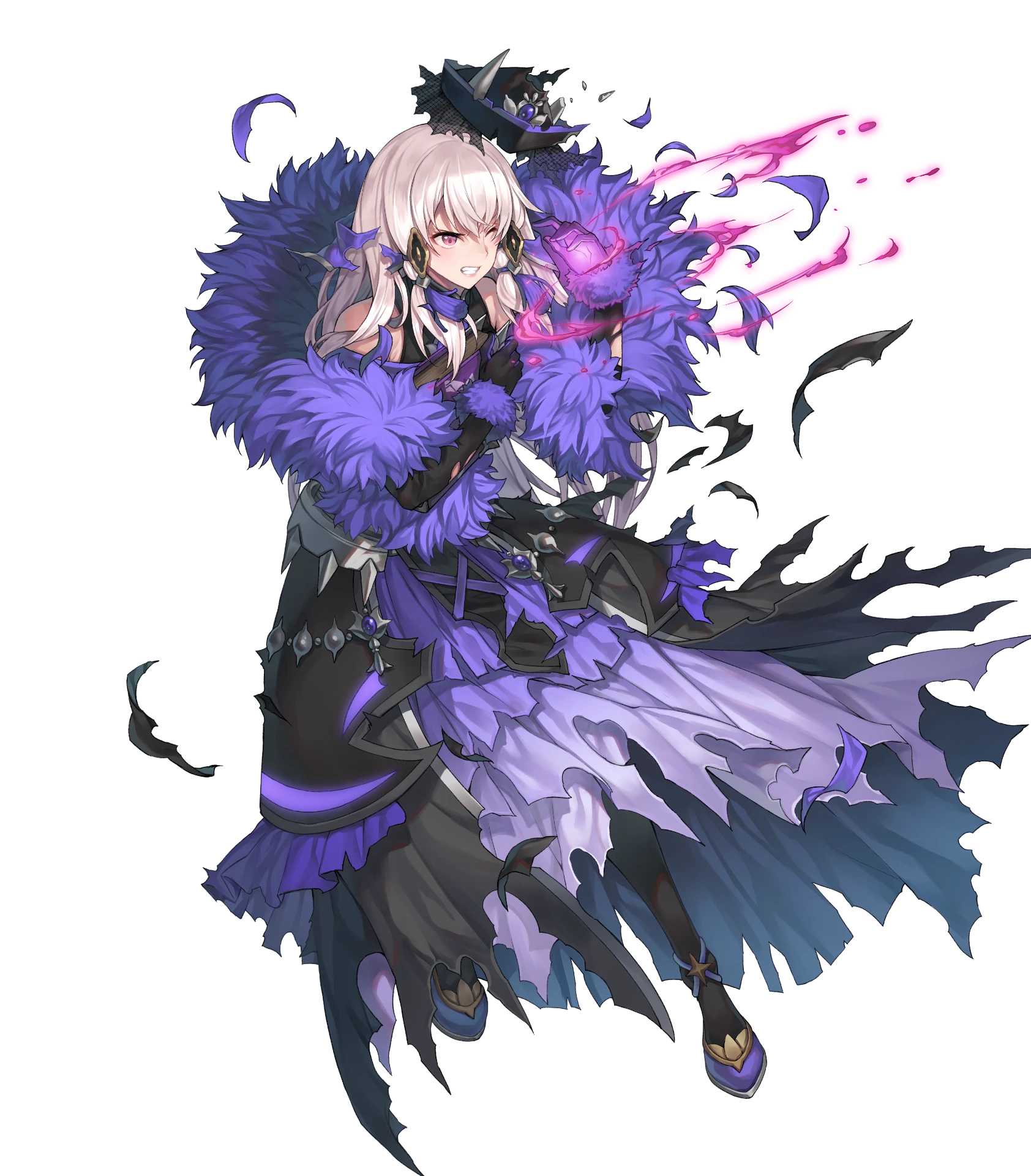 1girl black_dress black_gloves black_pantyhose book breasts clenched_teeth closed_mouth commentary_request damaged dress fire_emblem fire_emblem:_three_houses fire_emblem_heroes fur_trim gloves hagure_keg hair_ornament hat highres holding holding_book long_hair long_sleeves lysithea_von_ordelia lysithea_von_ordelia_(earnest_seeker) lysithea_von_ordelia_(earnest_seeker)_(resplendent) lysithea_von_ordelia_(timeskip) nintendo non-web_source official_alternate_costume official_art one_eye_closed pantyhose pink_eyes purple_dress purple_gloves shoes small_breasts solo tassel tassel_hair_ornament teeth torn_clothes v-shaped_eyebrows white_hair